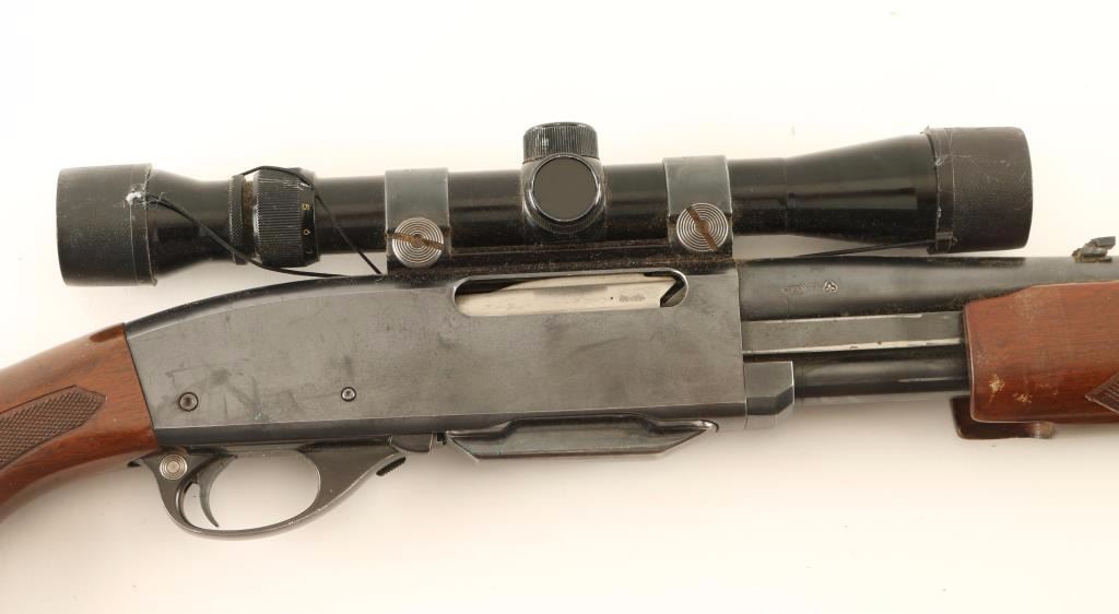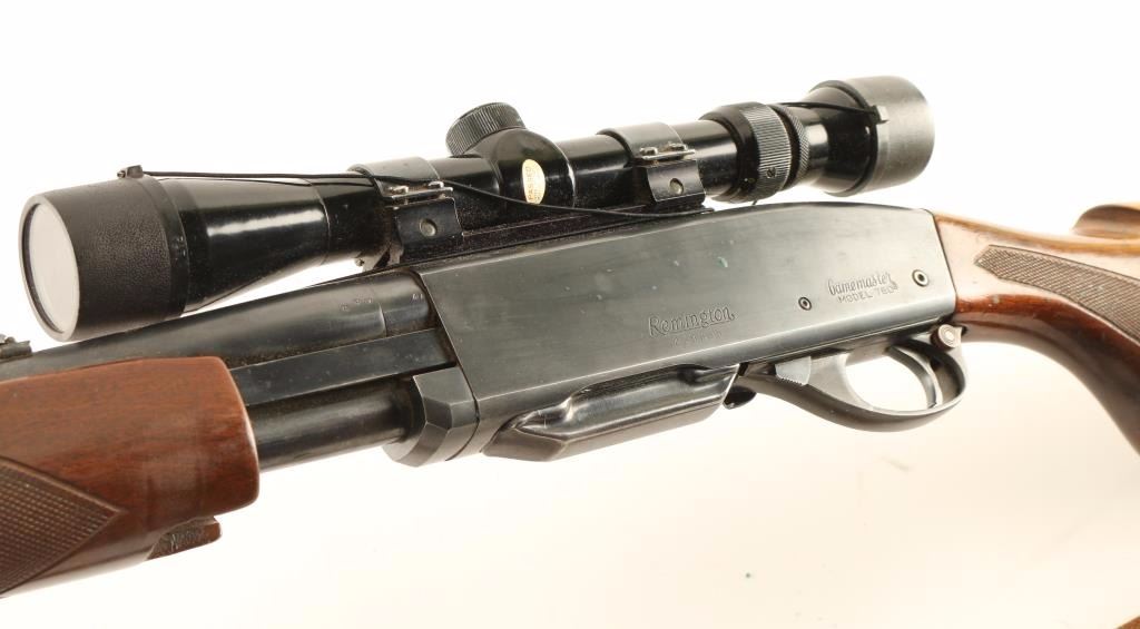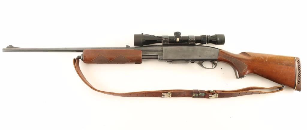 'Gamemaster' Slide-action sporting rifle chambered in .270 Winchester. Features a blued finish, 22" tapered barrel, ramped blade front sight with silver bead, flip-up adjustable rear sight, Tasco 3-9x 32mm scope, push button safety, detachable magazine, smooth trigger, brown leather sling, checkered walnut slide handle and pistol grip shoulder stock with Pachmayr recoil pad. Rifle exhibits approximately 90% of it's original blued finish showing scattered handling marks, light oxidation on the receiver and slide wear on the barrel, magazine tube & slide arm. Action is smooth, bore is excellent, optics are clear and wood stocks are good with a moderate amount of blemishes. Condition is good to very good. ***Modern Firearm***