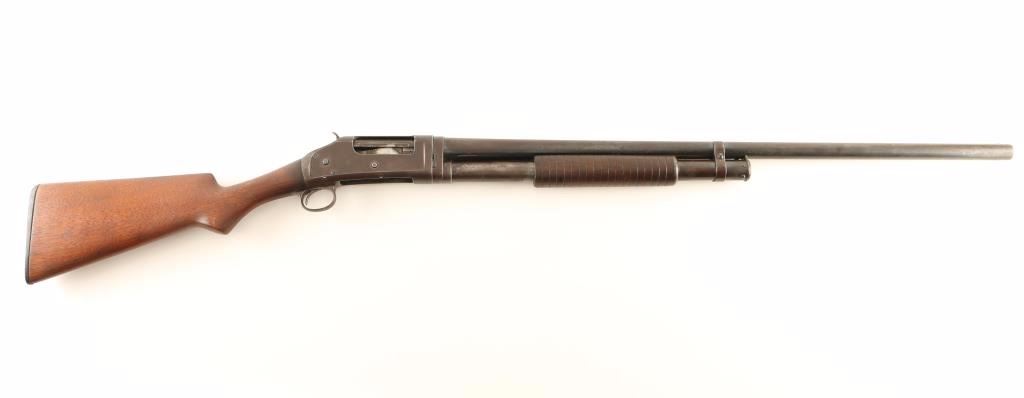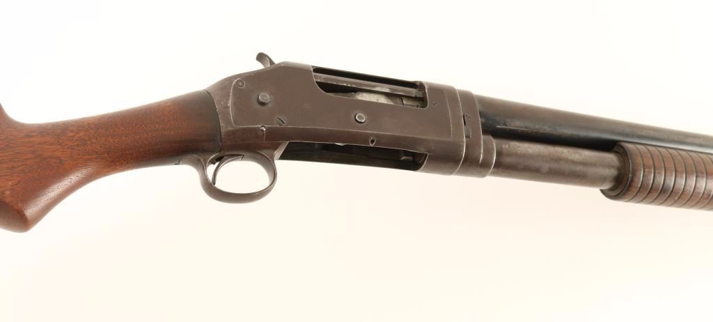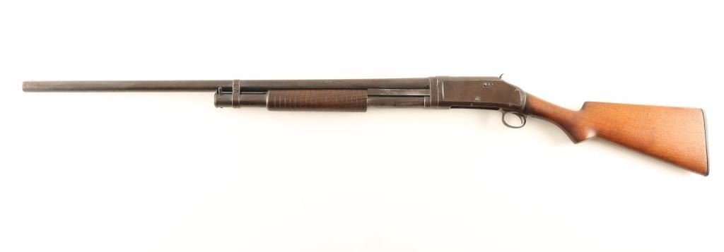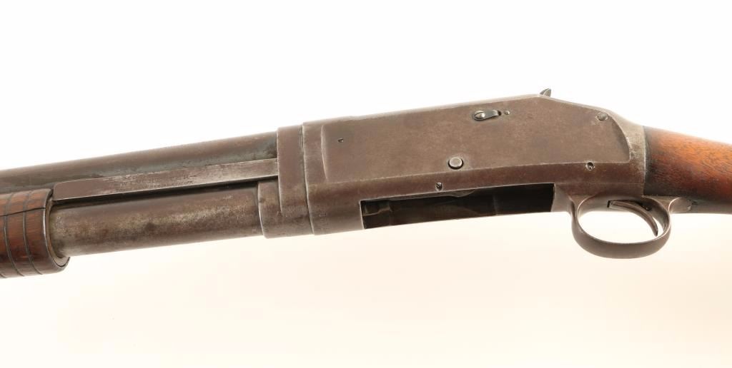 Vintage American made slide action repeating shotgun chambered for 2 3/4" 12 gauge shells, circa 1911. Features a blued finish, full choke 30" take-down barrel, brass bead front sight, 1/2 length tube magazine, exposed hammer with checkered spur, steel receiver, smooth trigger, grooved walnut slide handle and smooth pistol grip shoulder stock with factory buttplate. Shotgun retains a small about of it's blued finish in protected areas with the majority of the metal surfaced turned to a brown patina. Action performs well, bore is dull with some scattered pin prick pitting and wood stocks are good with a 1.5" crack on the left side of the slide handle. Condition is near good. ***C&R Firearm*** ***Modern Firearm***