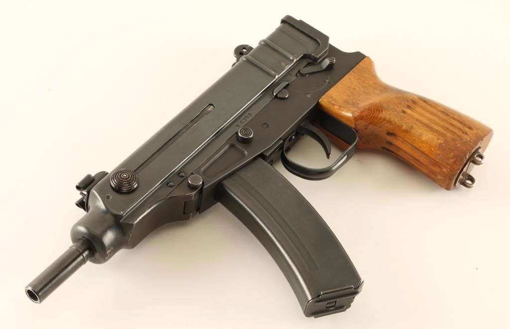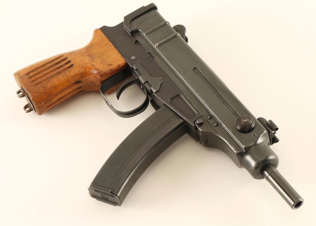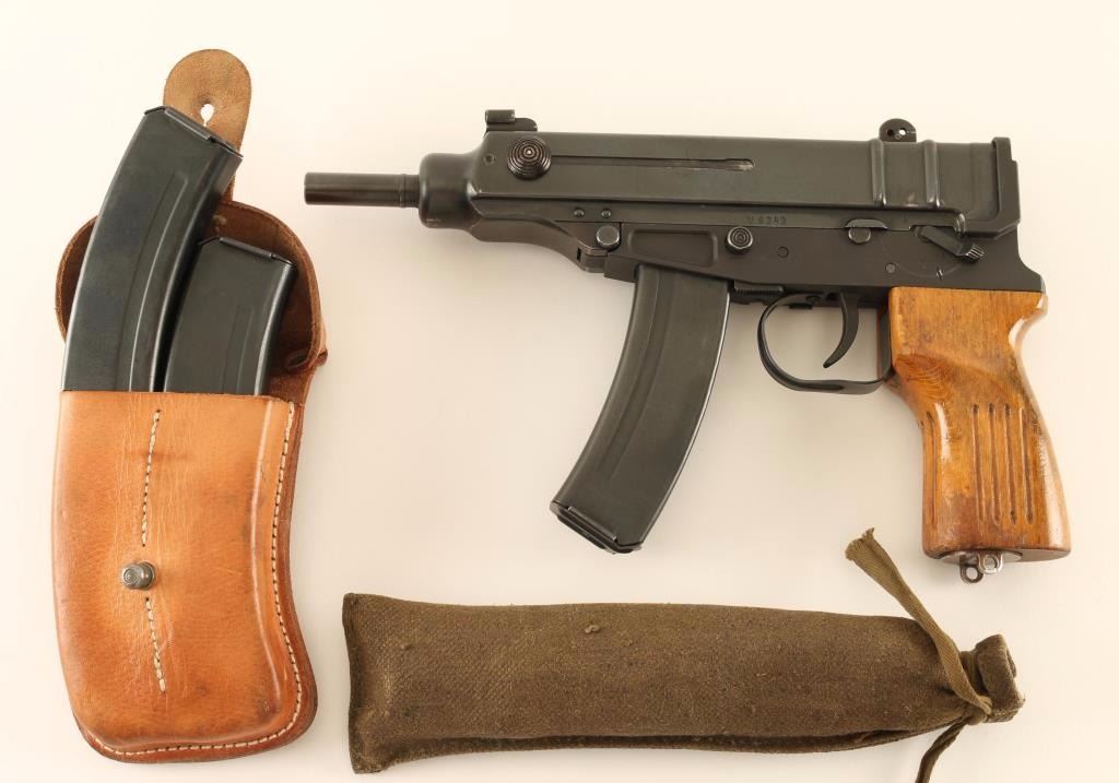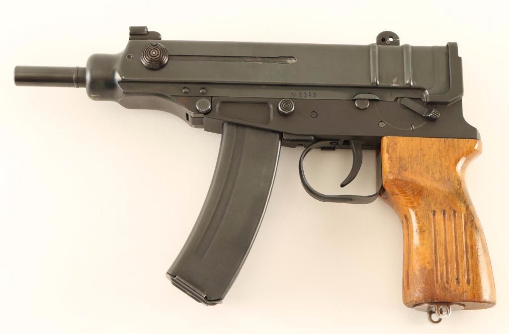 Commercially produced semi automatic variant of the Vz-61 machine-pistol, utilizing original & American made parts. Features a blued/matte black finish, 4.5" barrel, shrouded post front sight, dual leaf flip- rear sight, push button magazine release, 20 round magazine, thumb safety, and grooved wood pistol grip. Includes a cleaning kit, and leather mag pouch with two spare magazines. Pistol exhibits approximately 88% of it's original finish showing moderate wear. Action is smooth, bore is pristine, and wood grip is very good. Condition is very good+. ***Modern Firearm***