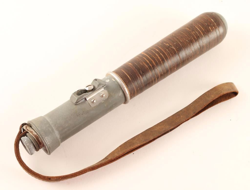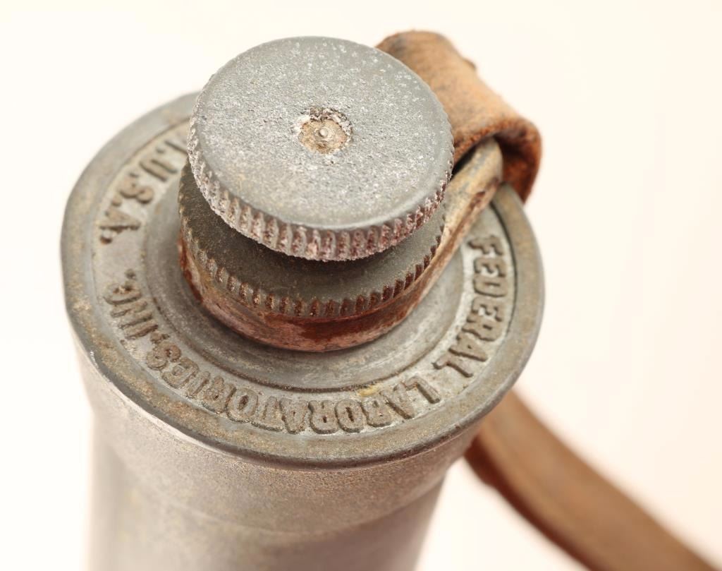 Rare type that uses a battery to fire gas cartridge. Made by Federal Laboratories, metal construction with leather wrapped club and leather strap. 'Pat. Sept 15, 1925, Dec. 15, 1925 and Dec. 29, 1925, B6310 Type M29'. 'Federal Laboratories Inc. Pittsburgh' stamped on the end of handle.