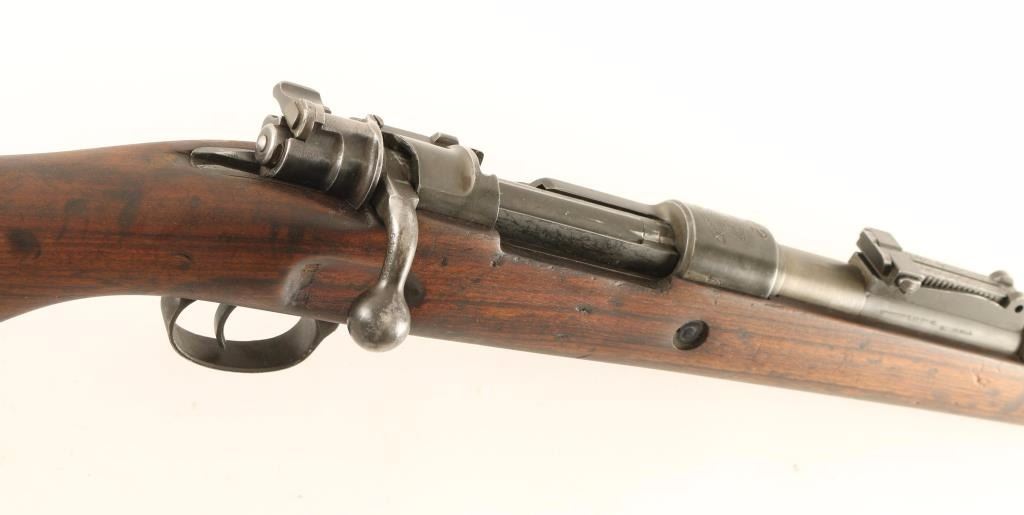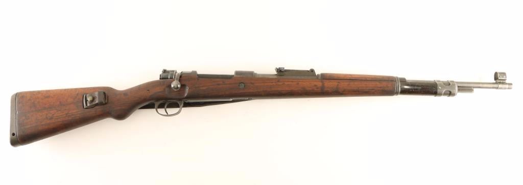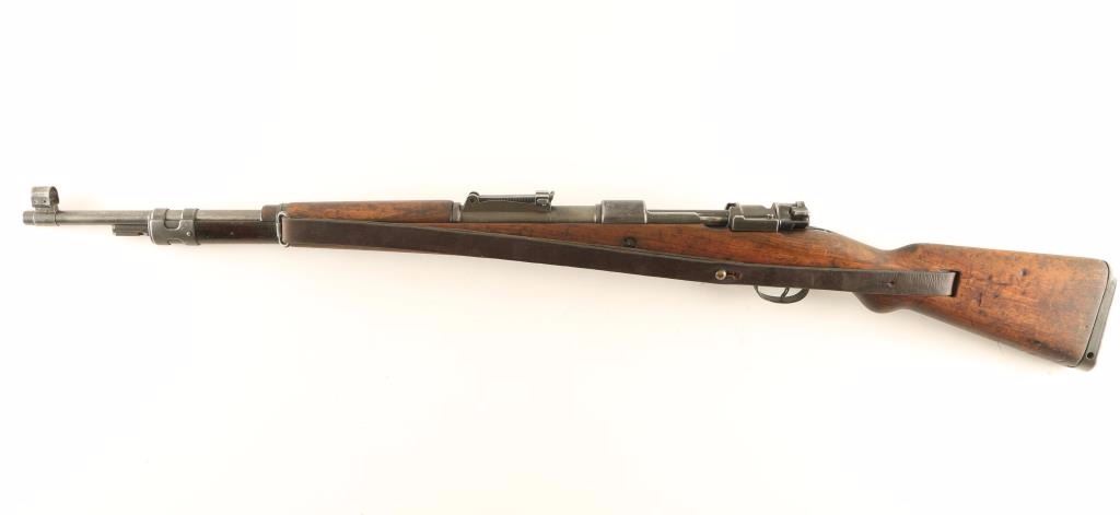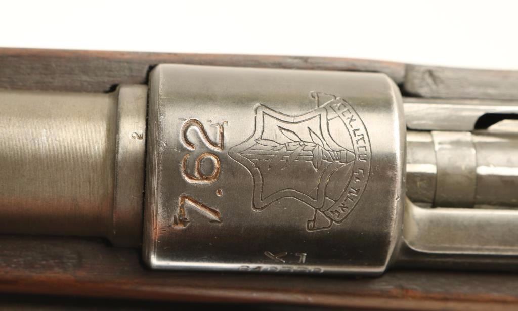 Israeli military bolt action service rifle chambered in 7.62x51mm Nato, originally produced in Belgium by FN and later rebuilt & rechambered. Features a blued finish, 24" barrel, dovetailed inverted 'v' front sight with cover, tangent rear sight graduated to 2,000 meters, bayonet lug, two barrel bands, integral 5 round box magazine, bent bolt handle, smooth trigger manual safety on bolt, smooth leather sling, smooth wood handguard and pistol grip shoulder stock with smooth metal buttplate. Non-matching serial numbers. Rifle exhibits approximately 15% of it's finish intact overall showing heavy wear with the majority of the metal surfaces bearing a thin finish or are in-the-white. Action is smooth, bore is pristine and wood stocks are very good with blemishes. Condition is good+. ***C&R Firearm*** ***Modern Firearm***