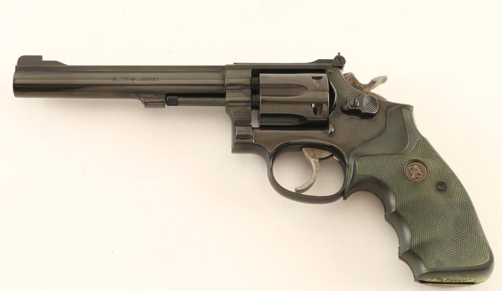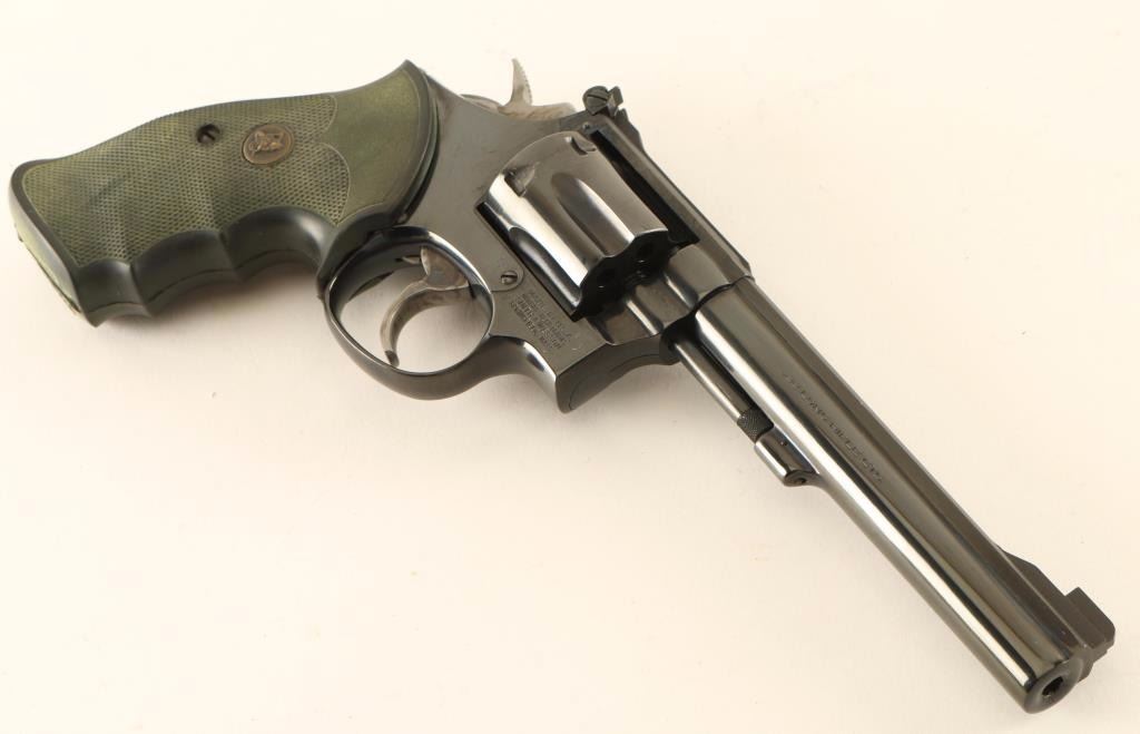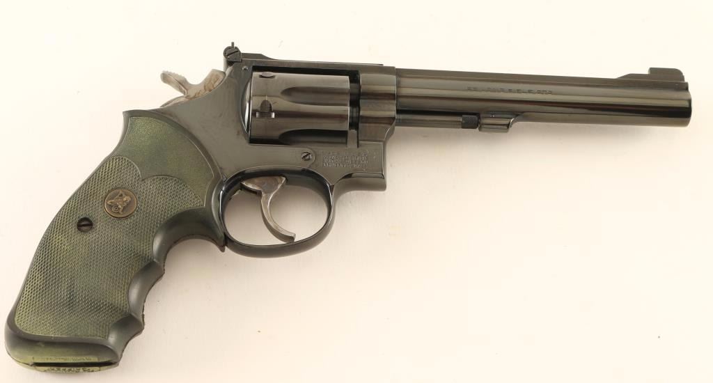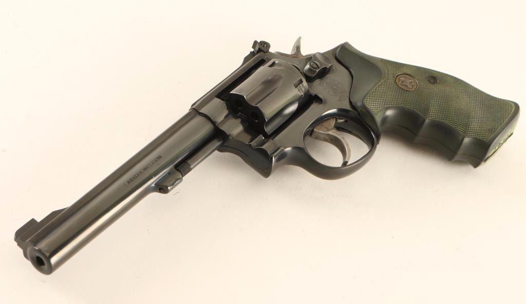 'K-22 Masterpiece' Medium fame double-action revolver chambered in .22 Long Rifle, circa 1988-1989. Features a blued finish, 6" ribbed barrel, non-shrouded ejector rod, ramped patridge front sight, adjustable micrometer click rear sight, fluted six-shot cylinder with recessed chambers, .312" smooth combat trigger, .375" target hammer, and Pachmayr Gripper checkered black rubber finger groove grips. Revolver exhibits approximately 95% of it's original blued finish showing a light drag line on the cylinder and a few small scattered scratches. Action is crisp with solid lock-up, bore is pristine and grips are very good. Condition is near excellent. ***Modern Firearm***