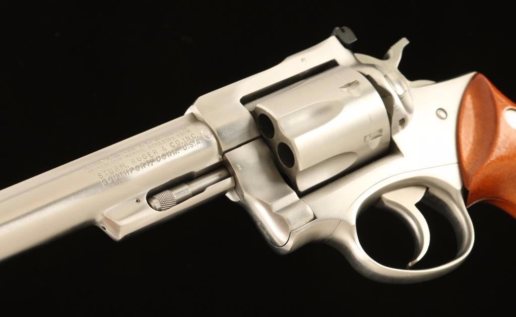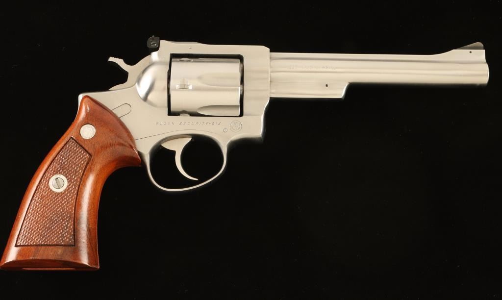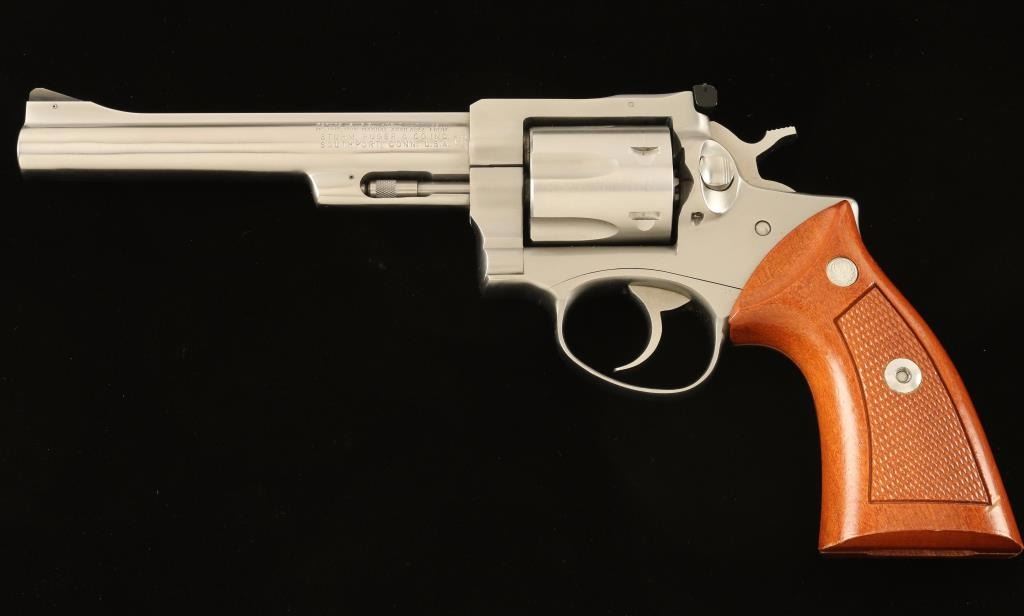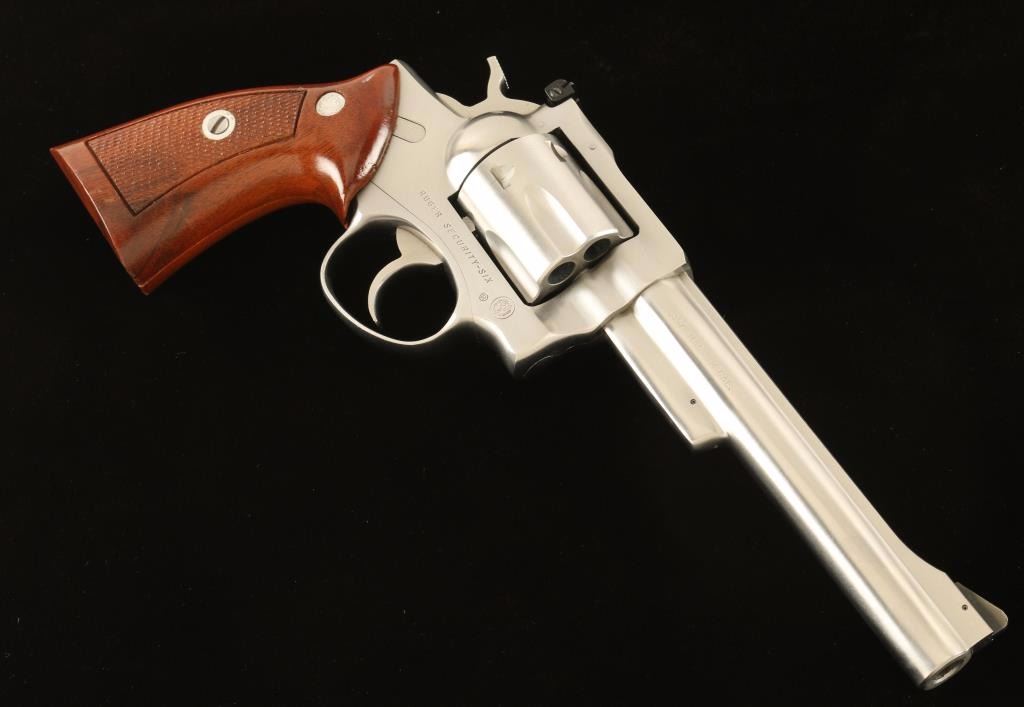 Medium frame stainless steel double-action revolver chambered in .357 Magnum, circa 1981. Features a brushed finish, solid ribbed 6" barrel, raised ramp front sight, adjustable rear window sight, shrouded ejector rod, fluted six-shot cylinder, transfer bar safety, smooth trigger, checkered hammer spur and two-piece checkered walnut target style grips with Ruger medallions. Revolver exhibits light handling marks and a drag line on the cylinder with no major wear observed. Action is tight with solid lock-up, bore is excellent and wood grips are near fine with a few small blemishes. Condition is near excellent. ***Modern Firearm***