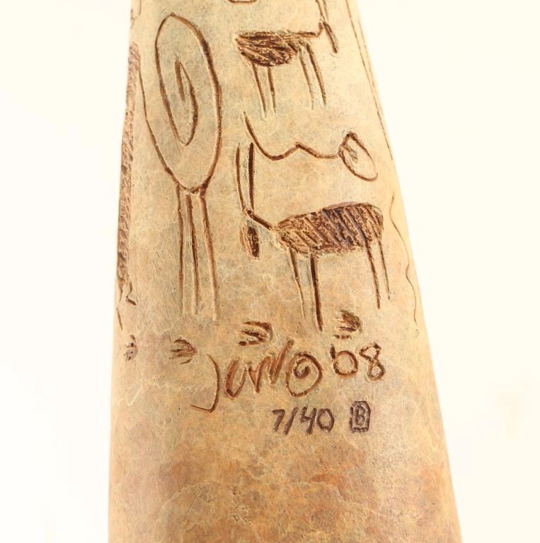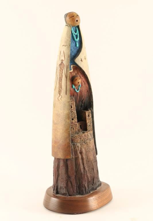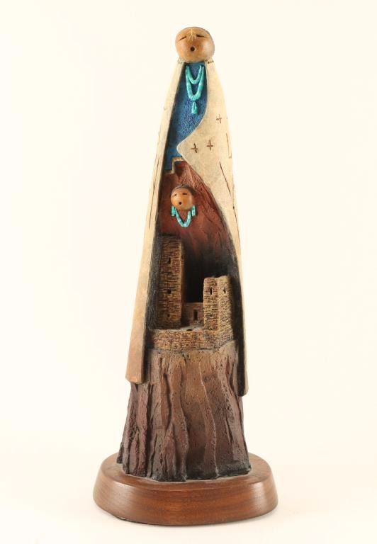 Number 7/40. Colorful Maize Mother with cliff dwelling carved into the bottom of her skirt with a lone figure floating above it. Petroglyphs are carved into the back of her shawl along with the artist's signature. Measures 11"x4"x3" on wood base.