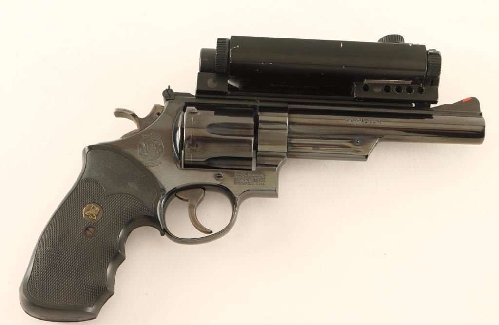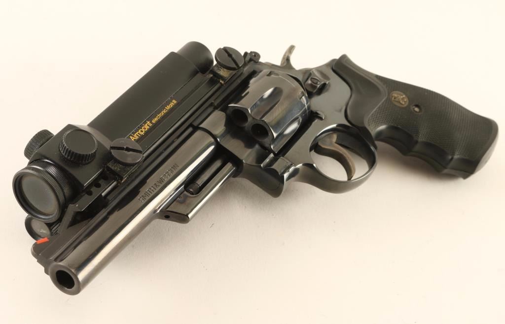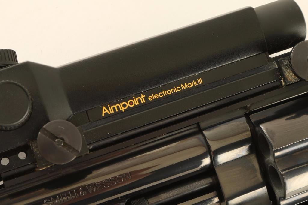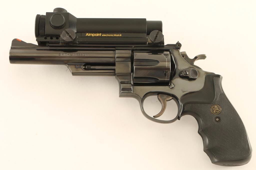 Large frame double-action revolver chambered in .44 Magnum, circa 1983-1987. Features a blued finish, 6" ribbed barrel, shrouded ejector rod, raised ramp front sight with orange insert, micrometer click rear sight with white outline, Aimpoint electronic Mark III installed on a scope rail marked "Jarvis Gunsmithing", fluted six-shot cylinder, .265" serrated trigger, .500" target hammer and Pachmayr Gripper checkered black rubber finger groove grips. Revolver exhibits approximately 96% of it's original finish showing light muzzle wear, a drag line on the cylinder and some light handling marks/scratches. Action is very tight with solid lock-up, bore is pristine and rubber grips are fine. Condition is near excellent as customized. ***Modern Firearm***