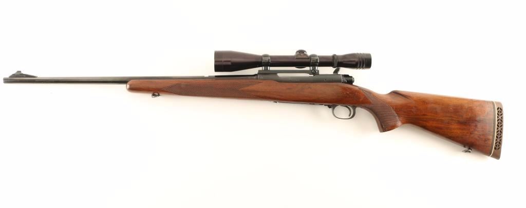 SN: 400008 Vintage American made light weight bolt action sporting rifle chambered in .30-06 Springfield, circa 1957. Features a blued finish, 22" tapered barrel, ramped blade front sight with brass bead, removed rear sight, Redfield 6x scope, serrated trigger, integral box magazine with hinged floorplate, manual safety, drilled & tapped receiver for a side mounted receiver sight, sling swivels and checkered walnut pistol grip shoulder stock with White Line recoil pad. Rifle exhibits approximately 87% of it's original blued finish showing scattered handling marks, a single small spot of dark rust on the barrel, some moderate wear, and heavier wear on the floorplate & bolt handle knob. Action is smooth, bore is very good+ and wood stock is good to very good with scattered finish loss & blemishes. Condition is good to very good. ***C&R Firearm*** ***Modern Firearm***