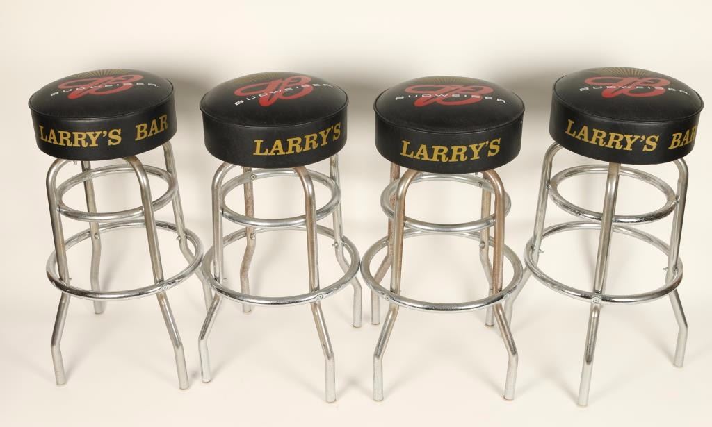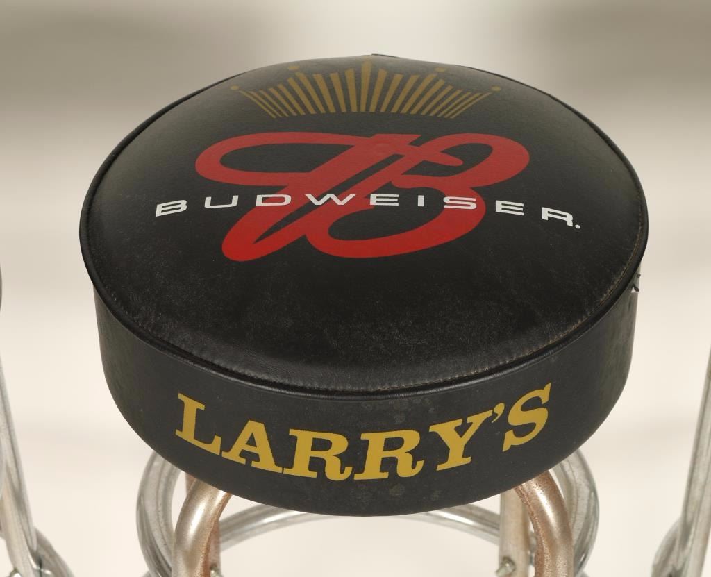 Black vinyl tops with Budweiser logo and chrome bases. Printed on side "Larry's Bar".