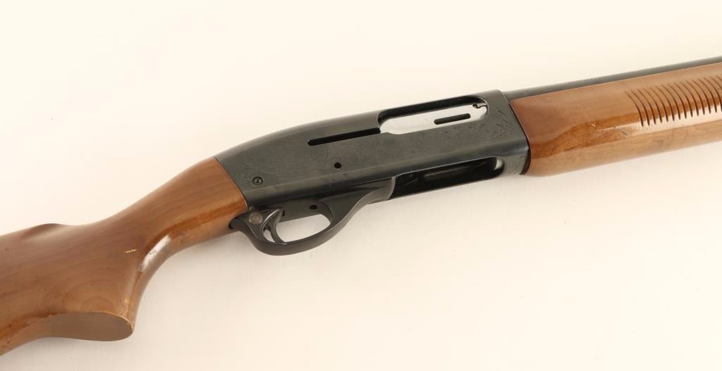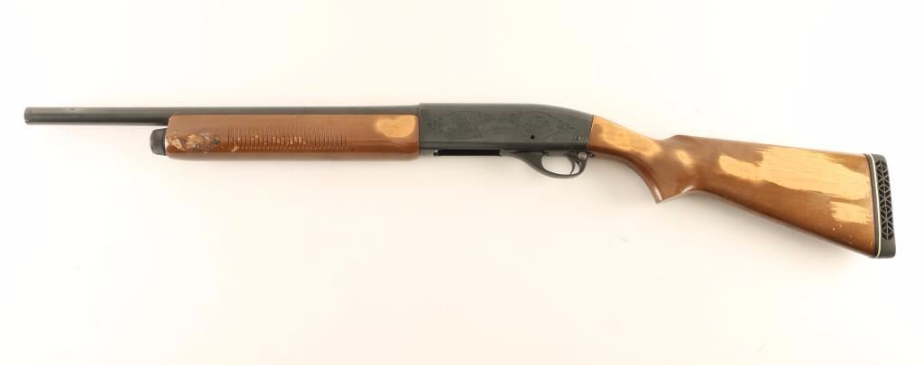 -Parts Gun- Semi-automatic shotgun with blued finish, cut-down 18.25" barrel, 2 3/4" chamber, light coverage scroll & game scene 'engraved' receiver, and wood stocks with recoil pad & 14 3/4" LOP. Missing the charging handle, trigger assembly pin and poss