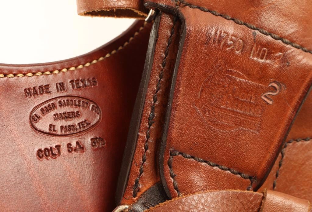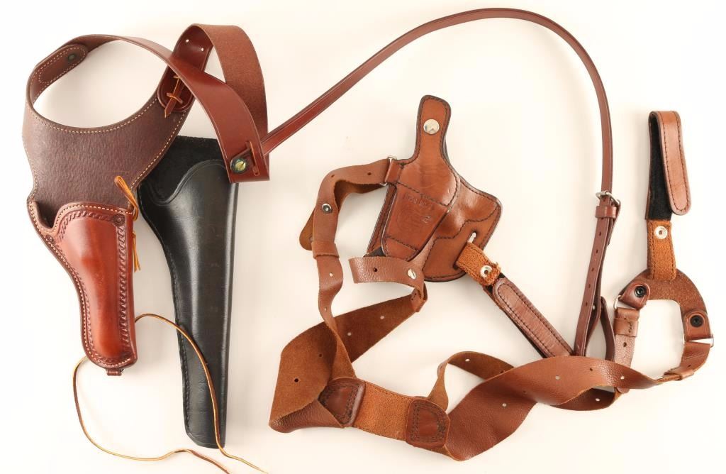 Including; Texan El Paso Saddlery Shoulder holster, Don Hann Shoulder holster both in smooth saddle brown leather and one black smooth leather Slim Jim holster.