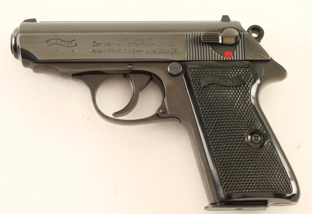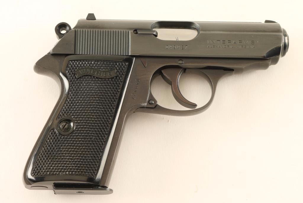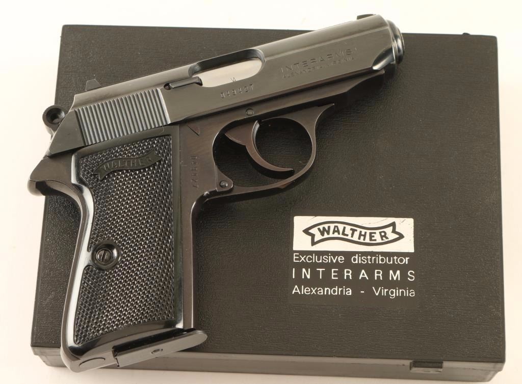 'Interarms' American made double-action semi-automatic compact pistol chambered in 9mm Kurz. Features a blued finish, 3.25" barrel, fixed patridge front sight, dovetailed rear window sight, thumb safety/decocker, serrated trigger, serrated round hammer spur, push button magazine release, factory 7 round magazine, steel beavertail frame and two-piece checkered black plastic grips with Walther banner. Includes the original factory hard case. Pistol exhibits approximately 98% of it's original blued finish showing slight edge wear and some minor handling marks/blemishes with the frame turned plum. Action is strong, bore is pristine and plastic grips are fine. Condition is excellent in box. ***Modern Firearm***