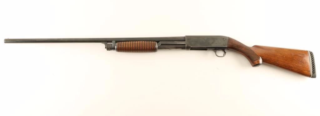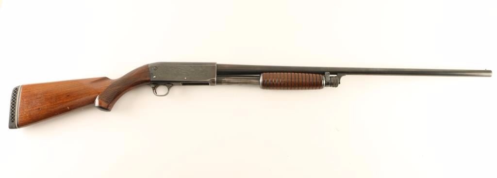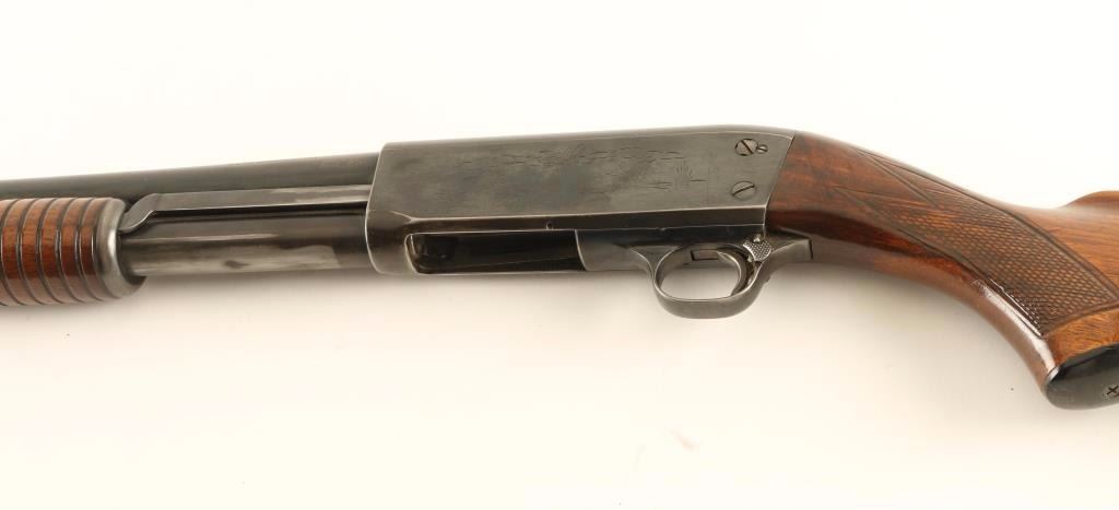 Vintage bottom ejecting slide action shotgun chambered for 2 3/4" 16 gauge shells, circa 1949. Features a blued finish, take-down 28" modified choke barrel, silver bead font sight, push button safety, smooth trigger, steel receiver with engraved game bird scenes, 4 round tube magazine, grooved walnut slide handle and pistol grip shoulder stock with White Line recoil pad. Shotgun exhibits approximately 70% of it's blued finish showing heavy carry wear on the barrel & receiver and heavy slide wear on the magazine tube & slide arm. Action is smooth, bore appears excellent but dirty and refinished wood stocks are very good. Condition is good to very good. ***C&R Firearm*** ***Modern Firearm***