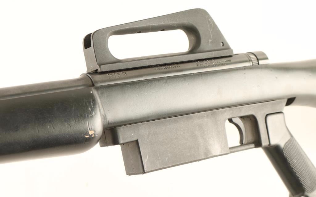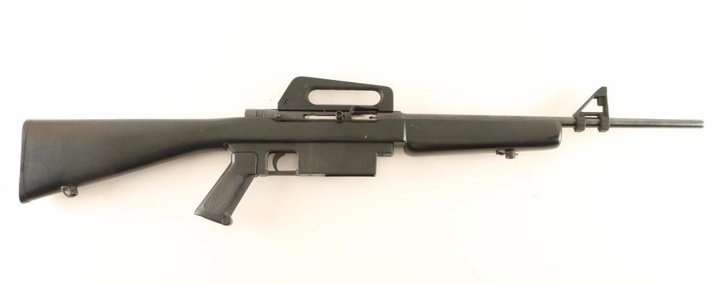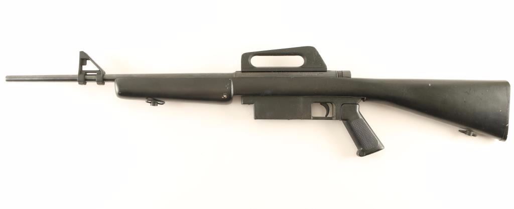 Filipino made semi-automatic rifle chambered in .22 Long Rifle, made to resemble a M16. Imported by K.B.I., Inc. of Harrisburg, P.A. with import marks on the receiver. Features a blued/black finish, 18.4" barrel, A1 style front sight, removable carrying handle with adjustable aperture sight, no magazine, serrated trigger, manual safety, shell deflector, serrated cylindrical charging handle, sling swivels, A1 style checkered black synthetic pistol grip, and black painted smooth wood shoulder stock. Rifle exhibits approximately 95% of it's original finish showing scattered oxidation and edge wear. Action is crisp, bore is very good, and wood stock is very good few blemishes. Condition is very good+++. ***Modern Firearm***