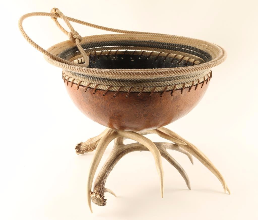 Antler base with large round gourd accented with a lariat. Could be used to display pine cones or to store kindling. Measures 14"x17".