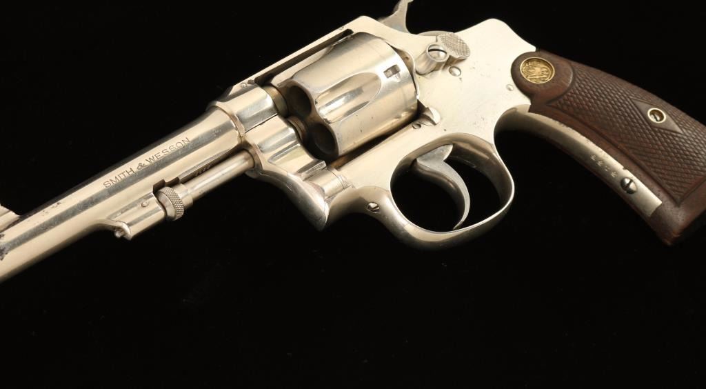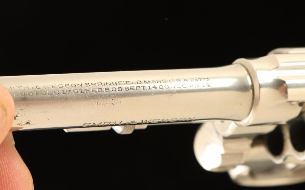 SN: 3135 Vintage small frame double action revolver chambered in .38 Smith & Wesson, circa 1917-1940. Features a nickel plated finish, pinned 4" barrel with forged round blade front sight, 'u' notched rear sight, non-shrouded ejector rod, fluted five-shot cylinder, case hardened .240" smooth trigger, .240" case hardened hammer with finely checkered spur, two-piece diamond checkered walnut grips with brass S&W medallions. The pistol has been extensively cleaned giving the nickel plated finish a brushed appearance with approximately 85% finish intact overall showing some scattered pin prick pitting. Action is smooth with good lock-up, bore is fair and wood grips are good. Condition is good. ***C&R Firearm*** ***Modern Firearm***