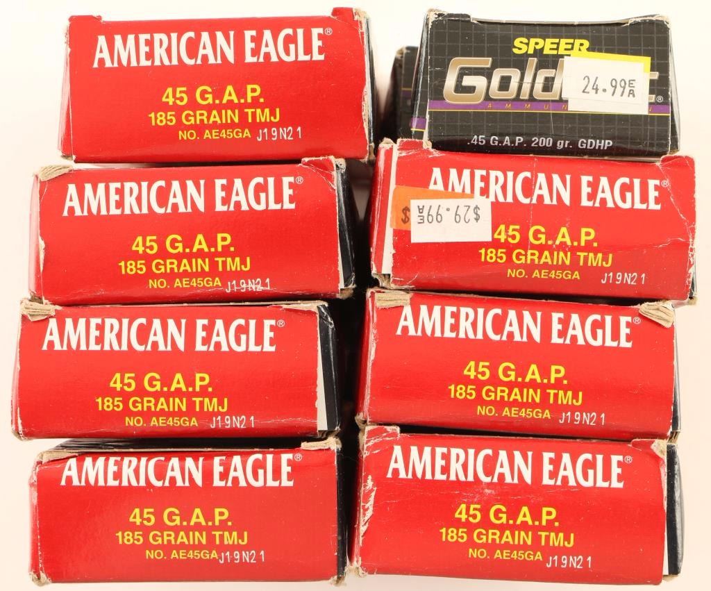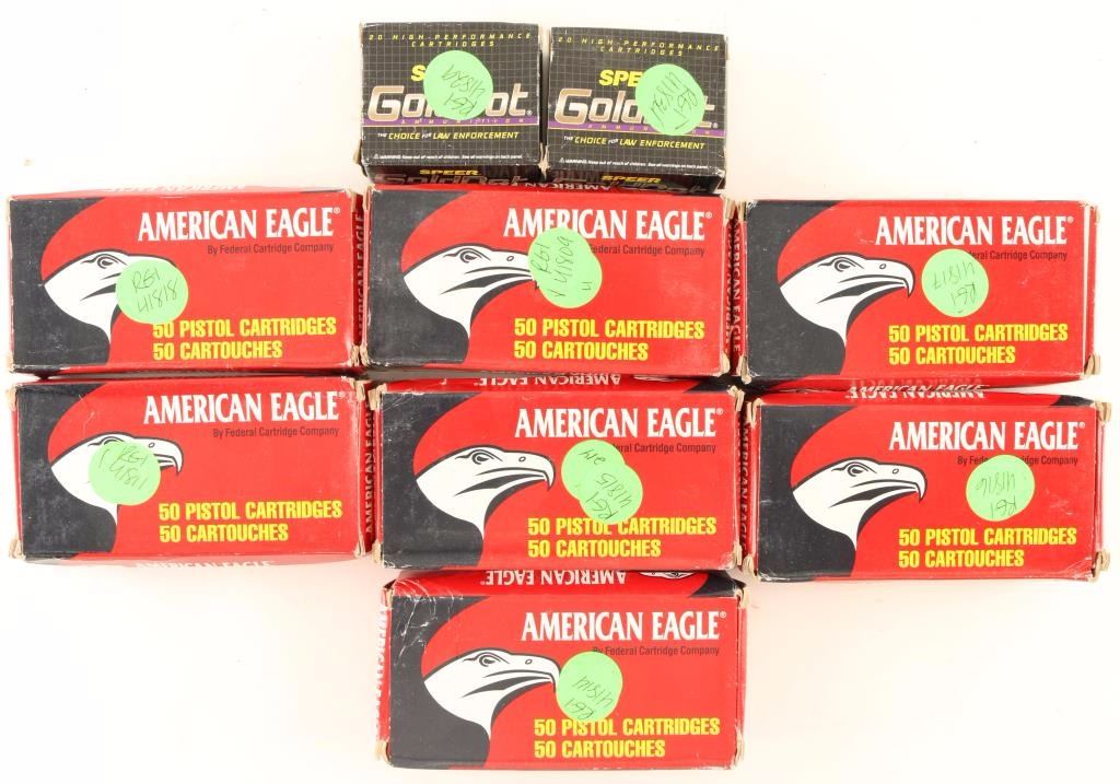 Seven boxes (350 rounds) of American Eagle and two boxes (40 rounds) of Speer Gold Dot. 390 total cartridges.