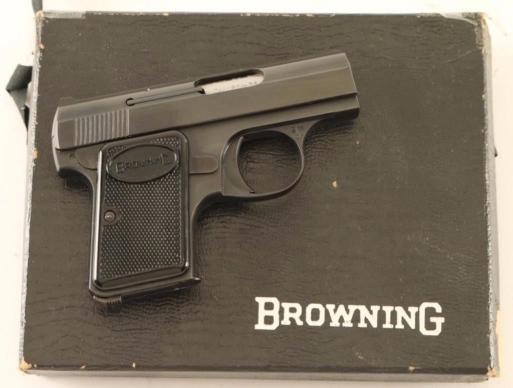 Belgium made single-action semi automatic pocket pistol chambered in 6.35mm, circa 1962. Features blued finish, 2" barrel, fixed sights, steel frame, smooth trigger, manual safety, 6 round magazine and two-piece checkered black plastic grips with Browning decor. Includes a factory presentation box with a label on the underside dated 3/31/62. Pistol exhibits approximately 98% of it's original blued finish showing slight edge wear and a few small scratches on the slide. Action is sound, bore is excellent and grips are fine. Condition is excellent in box. ***C&R Firearm*** ***Modern Firearm***