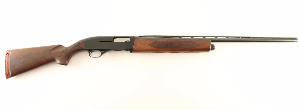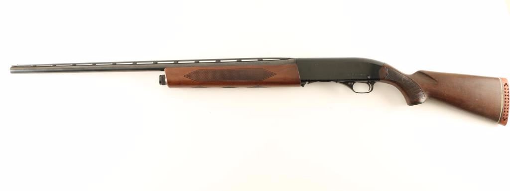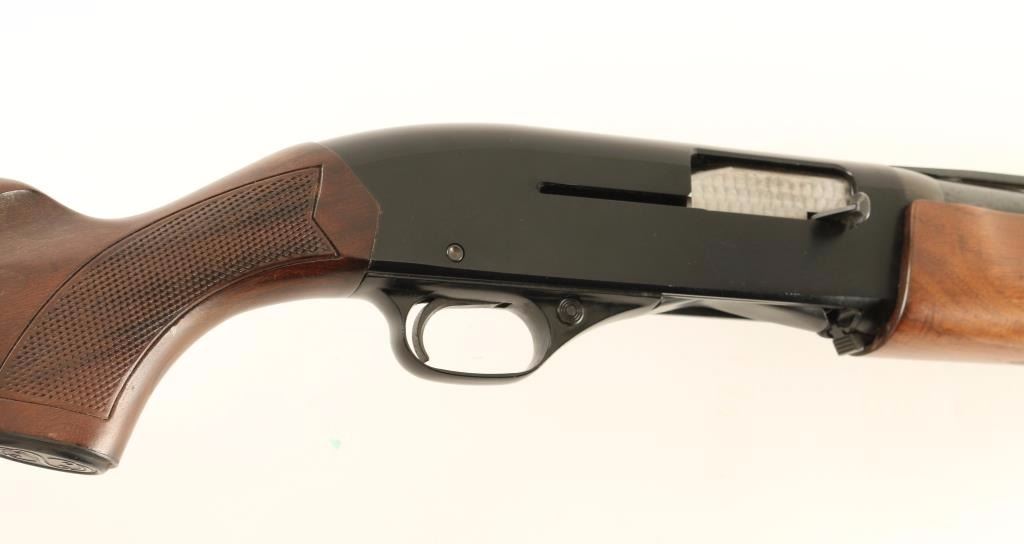 American made gas operated semi-automatic shotgun chambered for 2 3/4" 20 gauge shells. Features a blued/black finish, 28" modified choke barrel with serrated ventilation rib, silver bead front sight, 2 round magazine tube, jeweled bolt, beveled trigger, push button safety, smooth charging handle, press checkered wood forend and pistol grip shoulder stock with red factory recoil pad. Shotgun exhibits approximately 80% of it's original finish with scattered freckles of light surface rust on the barrel and small scattered spots of wear on the receiver. Action is strong, bore is bright with some debris and wood stocks are very good with some minor blemishes. Condition is good++. ***Modern Firearm***