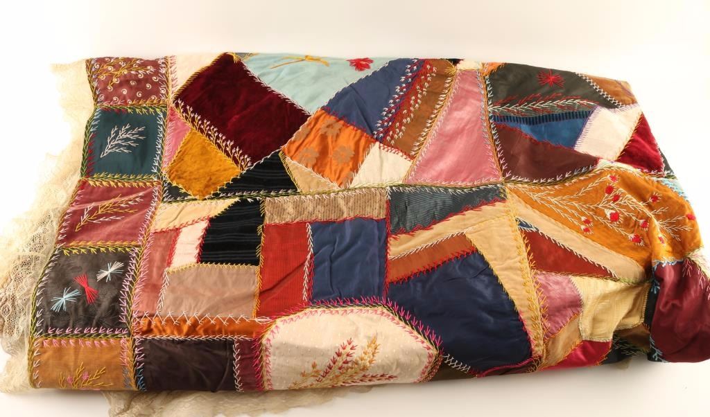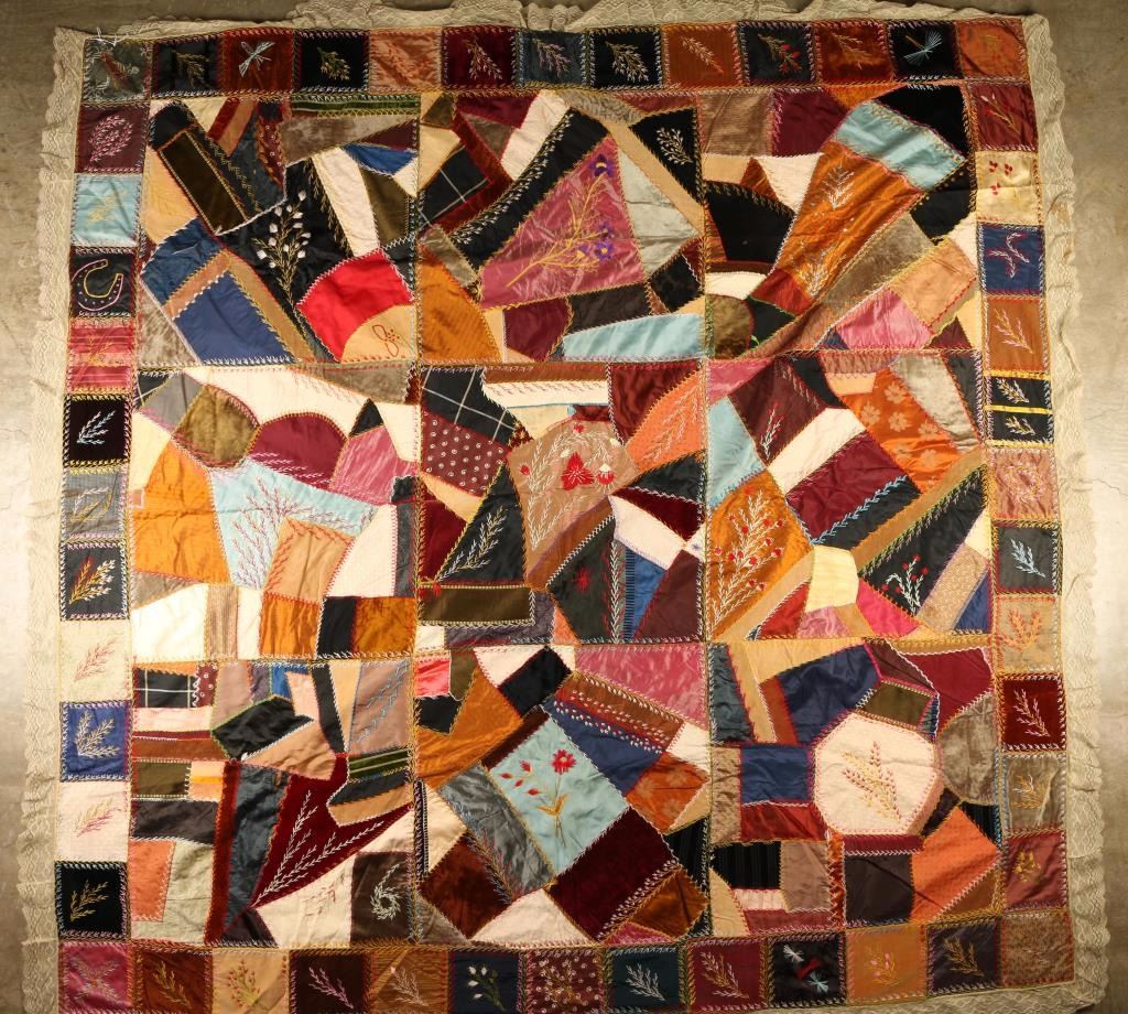 Floral and butterfly designs. Measures 79"x79". Multi piece hand made construction with lace around the edge.