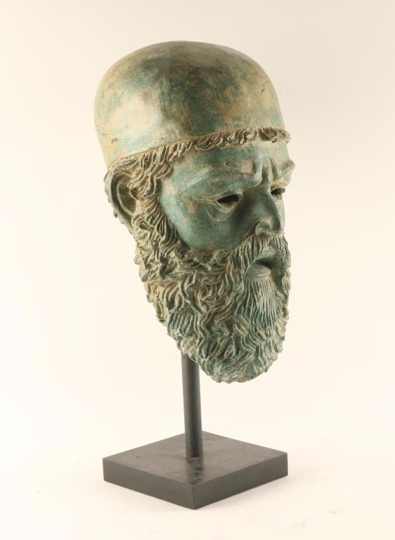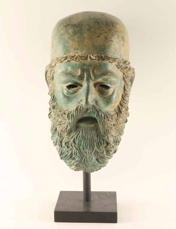 Bald bearded man with mottled green finish. Unsigned on a black pedestal base. Measures 17"x9".