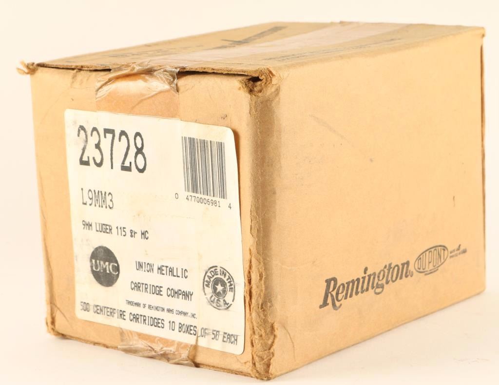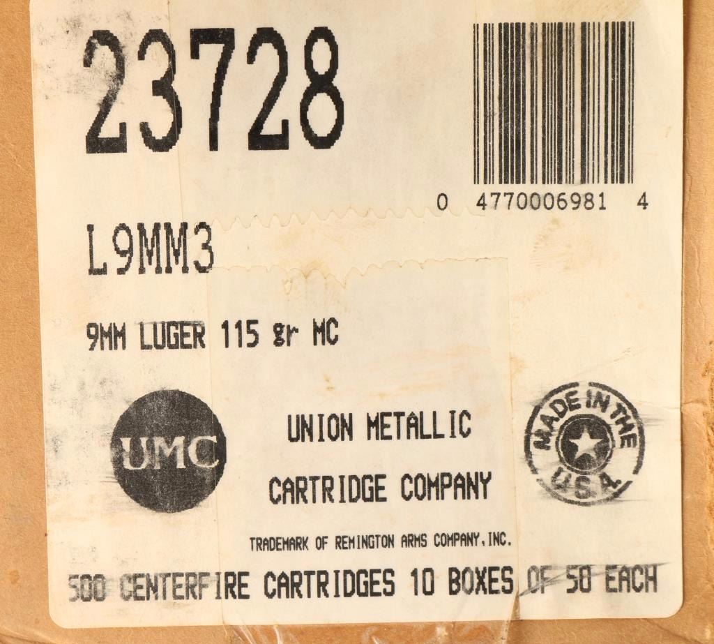 Box containing 10 boxes of 50 rds each-500 total. 9mm Luger 115 Gr MC. Made by Union Metallic Cartridge Co.