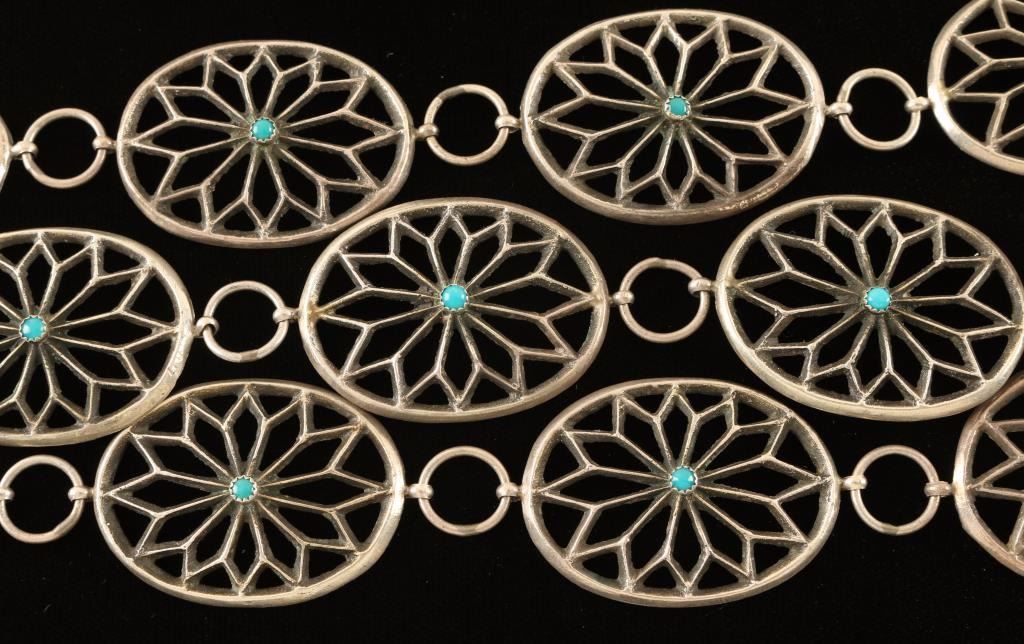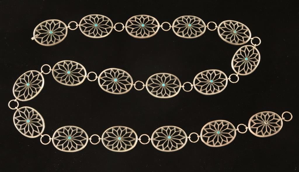 Sterling silver concho belt set with a center turquoise cab in each center of the 17 delicate openwork flowers. Hand hammered conchos, missing one small cab at the end of belt. Circa 1920-30s, unsigned.