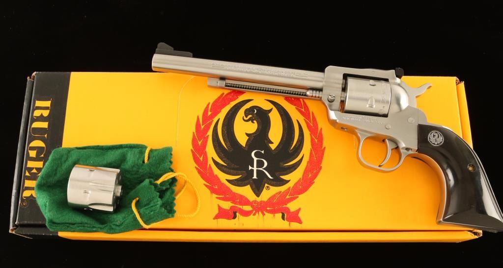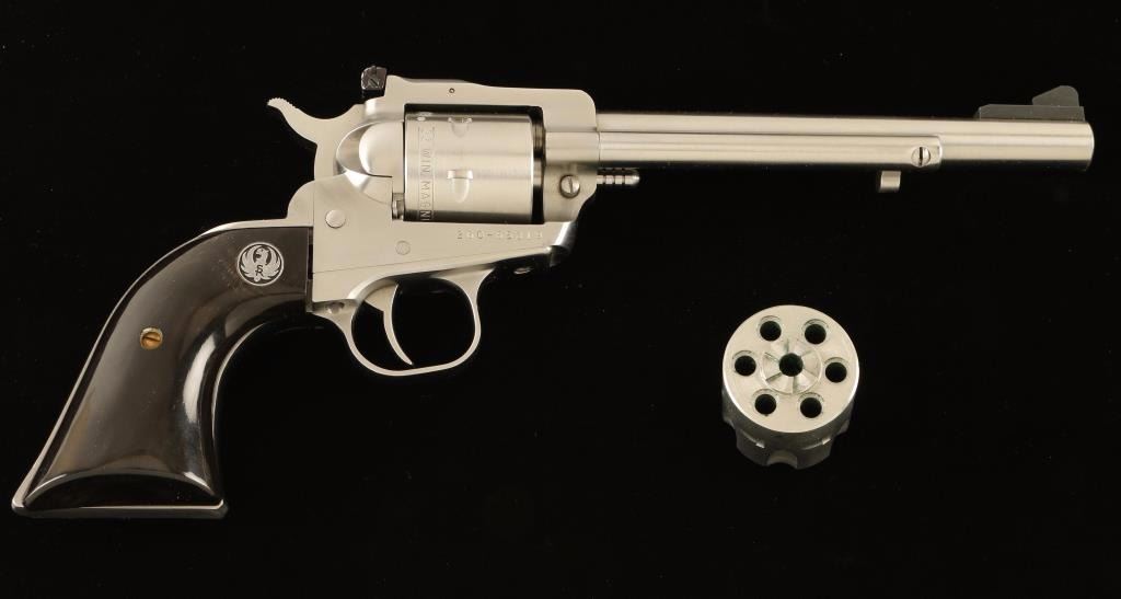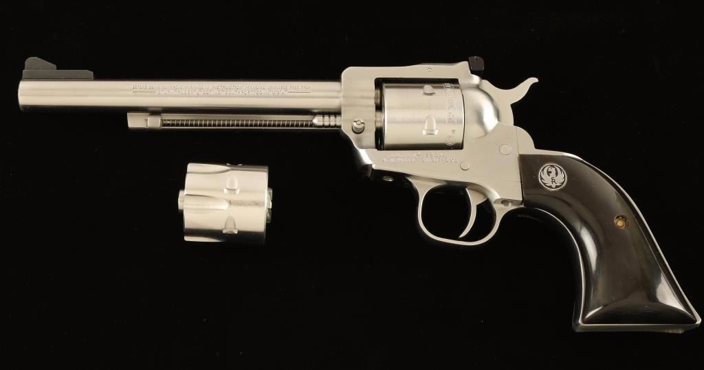 SN: 260-55319 Small frame stainless steel single action revolver with convertible cylinders chambered in .22 Magnum and .22 Long Rifle, circa 1985. Features a brushed finish, 6 1/2" barrel, raised ramp front sight, adjustable rear window sight, ejector rod, non-fluted six shot .22 Mag cylinder, transfer bar safety, smooth trigger, serrated hammer spur and custom two-piece buffalo horn grips with Ruger medallions. Includes a factory cardboard box, shipping box and .22 Long Rifle fluted conversion cylinder. Revolver exhibits moderate handling wear and a light drag line with no major imperfections. Action is smooth with solid lock-up, bore is pristine and custom horn grips are fine but are slightly ill-fitting. Condition is very good+++. ***Modern Firearm***