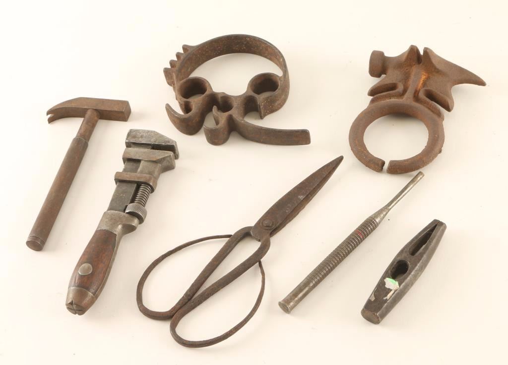 Including; small wrench, small metal hammer and hammer head, hand held hammer, and more. Nice aged patina.