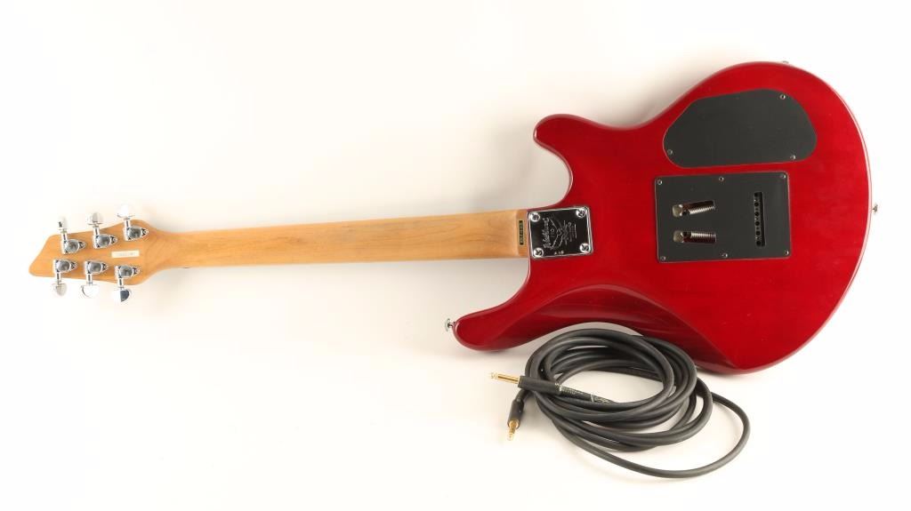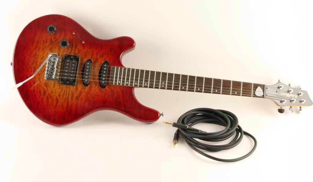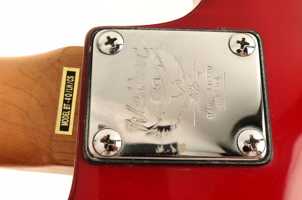 Six string left hand electric guitar that has a sunburst red pattern with a maple neck. Good condition, hardly played.