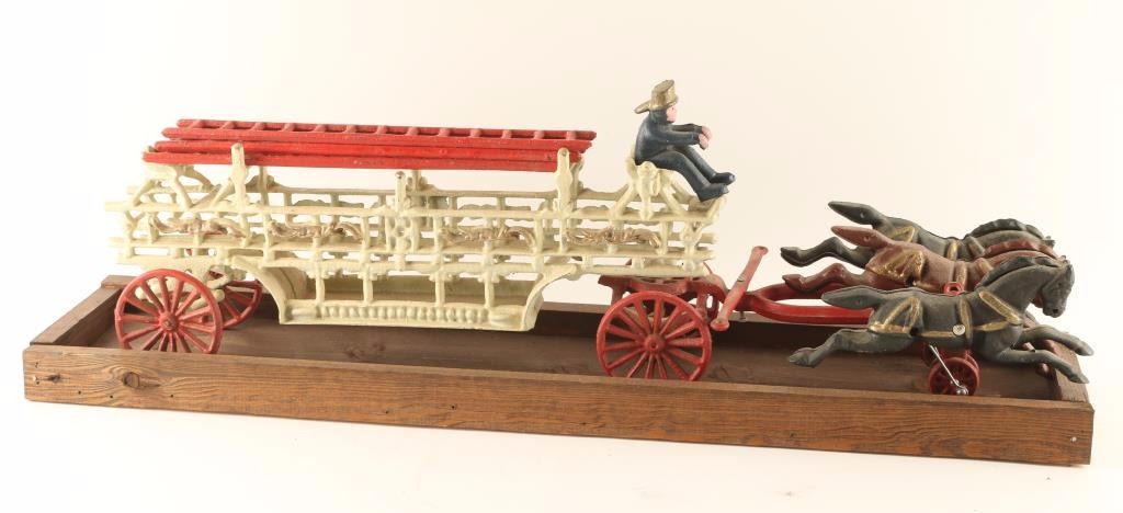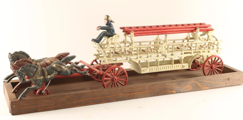 White and red fire rig with gold accents has removable red ladders. Fireman sits on seat of wagon driving a three horse team that still has some motion when pushed along a hard surface. Measures 26 1/4"l x 8 3/4"h x 6 1/2"w. Comes on wooden stand. Unknown age. Great old fashioned fun!