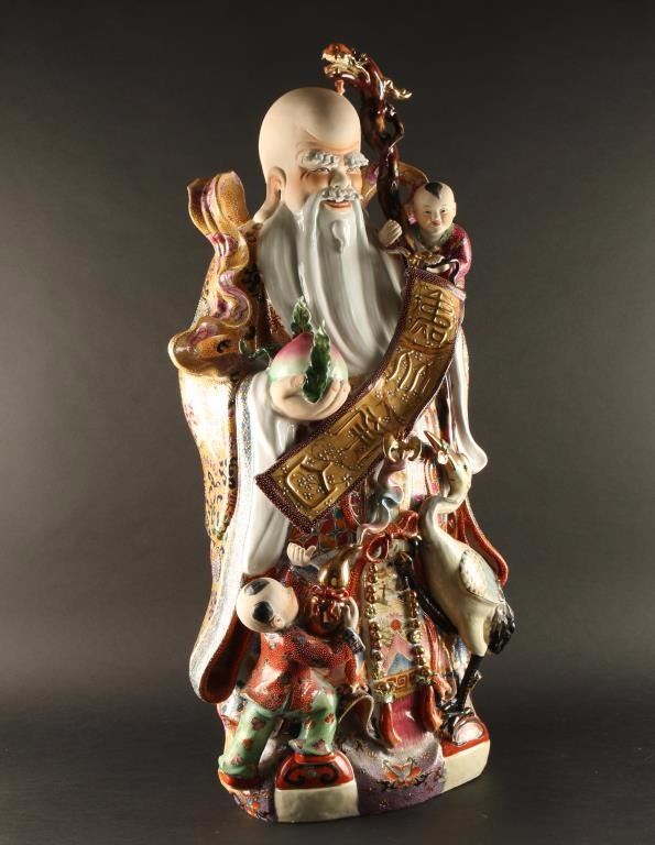 Hand painted smiling porcelain god with long white beard, holding a wooden staff with scroll in one hand and a peach in the other. A child sits on one shoulder with another child and a crane at his feet. Measures 33"x15".