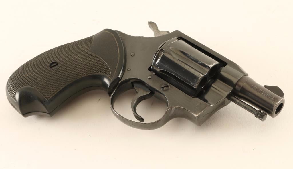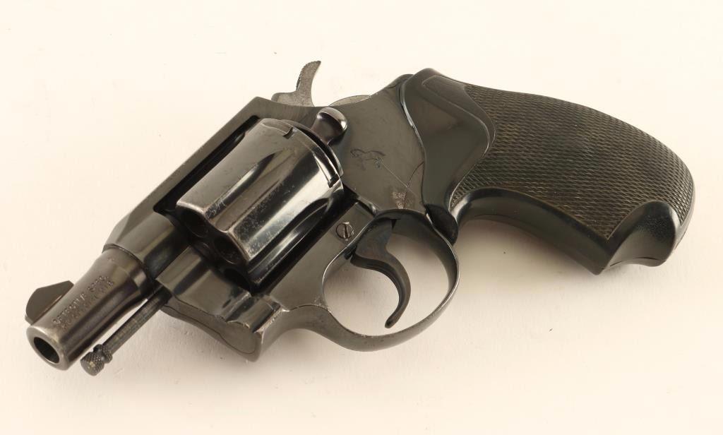 '2nd Issue' Small frame double-action snub nosed revolver chambered in .38 Special, circa 1969. Features a blued finish, 2" barrel, non-shrouded ejector rod, patridge front sight, square notched rear sight, long fluted six-shot cylinder, serrated hammer spur & trigger, and Pachmayr Presentation/Compac two-piece checkered black rubber grips. Revolver retains approximately 75% of it's original blued finish showing holster wear and scattered pin prick pitting. Action is smooth with solid lock up, bore is excellent and rubber grips are good. Condition is near good. ***Modern Firearm***