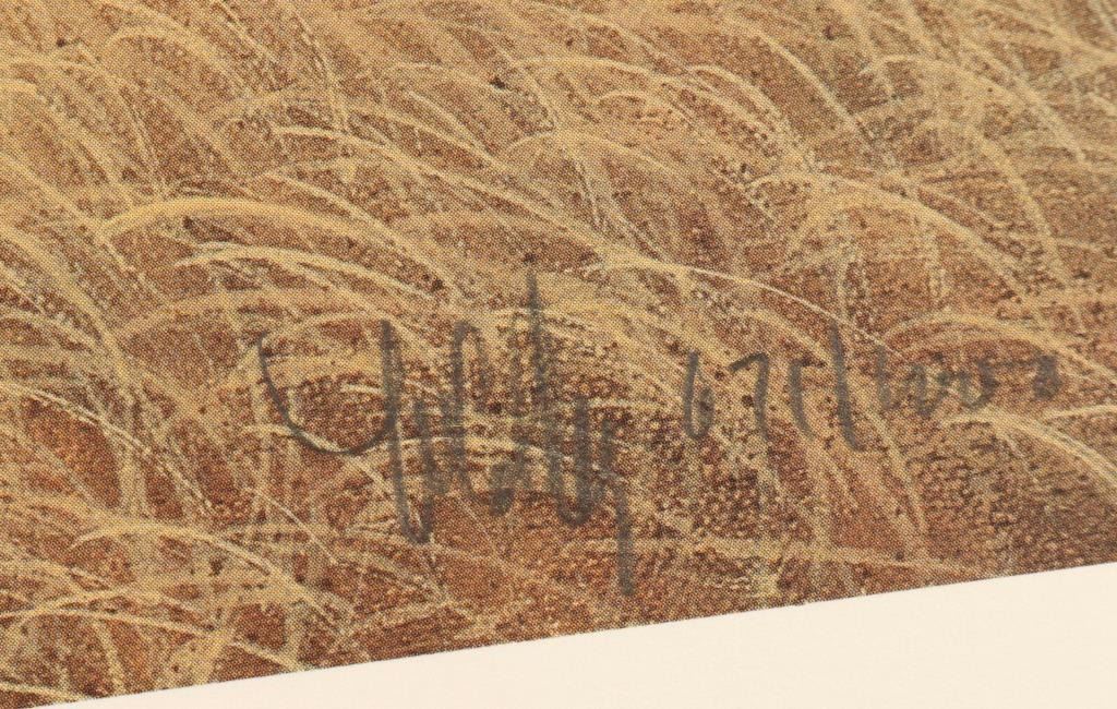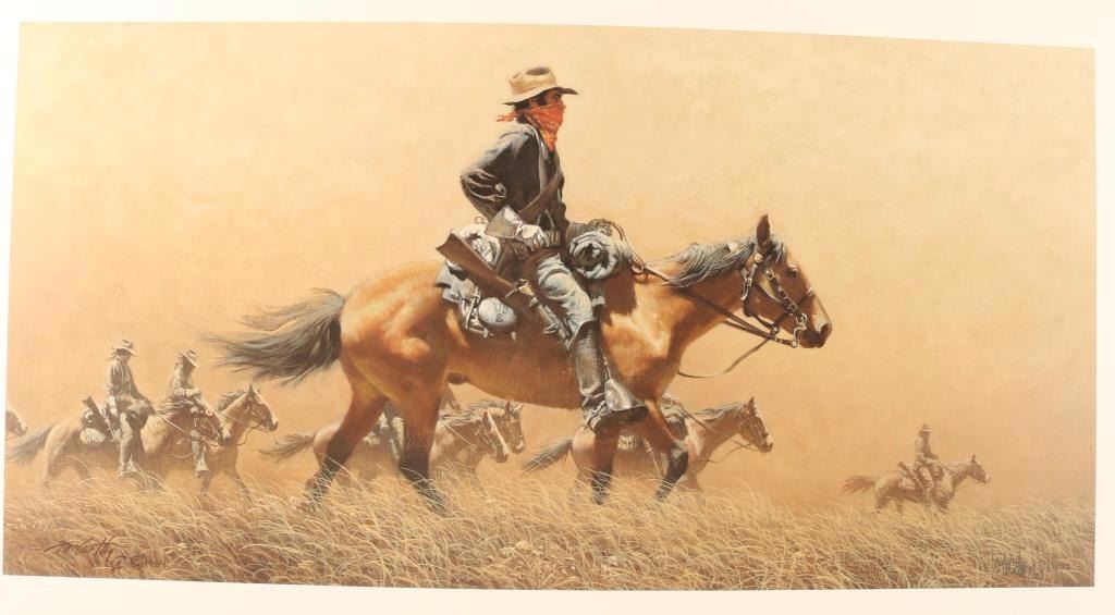 "After the Dust Storm" 671/1000 hand signed in pencil lower right. Image measures 11 3/4"x12 1/2". Print only with information on the artist in a Greenwich Workshop folio. Frank McCarthy was born in New York City and was drawn to the West since he read Will James novels as a boy. He was also intrigued by N.C. Wyeth illustrations. Frank McCarthy's formal training was at the Pratt Institute and had a career in commercial art and as an illustrator. The lure of the West was strong and he eventually settled in Sedona, AZ and became a member of the Cowboy Artists of America. Frank has had several shows in prominent museums and his work has appeared in many national magazines.