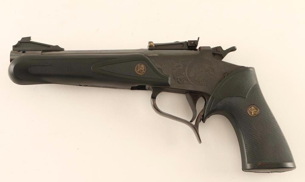 Modular break-action single shot pistol chambered in .44 Magnum, circa 1978. Features a blued finish, half octagon 8" ported barrel with threaded muzzle, ramped patridge front sight, adjustable rear window sight, engraved receiver with cougar scenes on both sides, manual safety on the hammer, serrated trigger, Pachmayr checkered black rubber forend, and Pachmayr Presentation one-piece wrap around pistol grip. Pistol retains approximately 95% of it's blued finish showing bright areas of wear on the barrel from rubbing on the frame, a single speck of light surface rust near the barrel ports on the right side and a scratch on the barrel below the rear sight on the right side. The rear sight window has been pained red and the adjustment screw have been secured in place by glue or resin. Action is crisp, bore is excellent, and rubber furniture is fine Condition is near excellent. ***Modern Firearm***