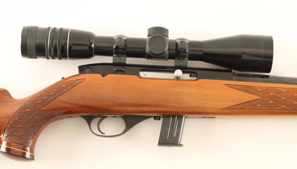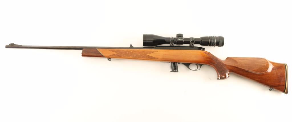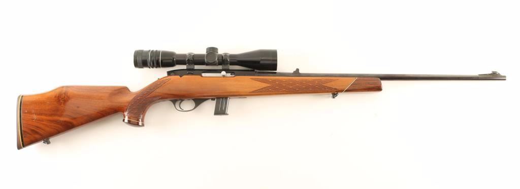 Fine Italian made semi-automatic rimfire rifle with blued/black finish, 24" tapered barrel, open sights, Weatherby Premiere fixed power scope, alloy receiver, detachable magazine, magazine cut-off, adjustable trigger, sling swivels and Monte Carlo style stock with forend cap, grip cap skip line checkering & factory recoil pad. Approximately 94% finish intact overall with some oxidation and few freckles of surface rust on the barrel. Action is smooth, bore is very good and wood stock is good to very good. Condition is good to very good. ***Modern Firearm***