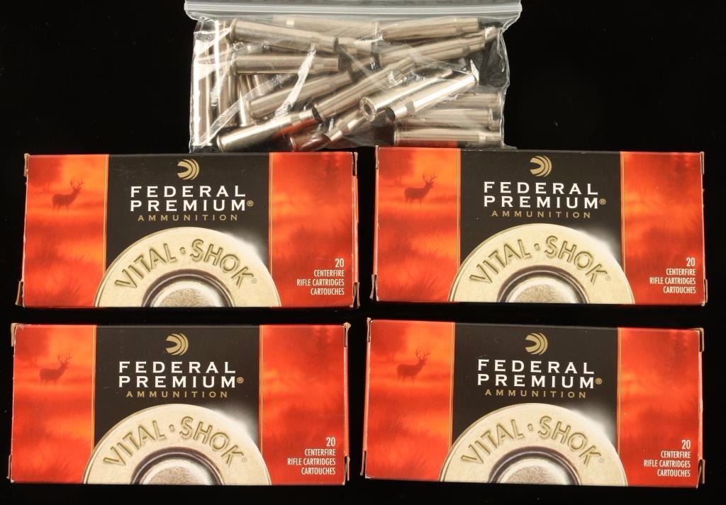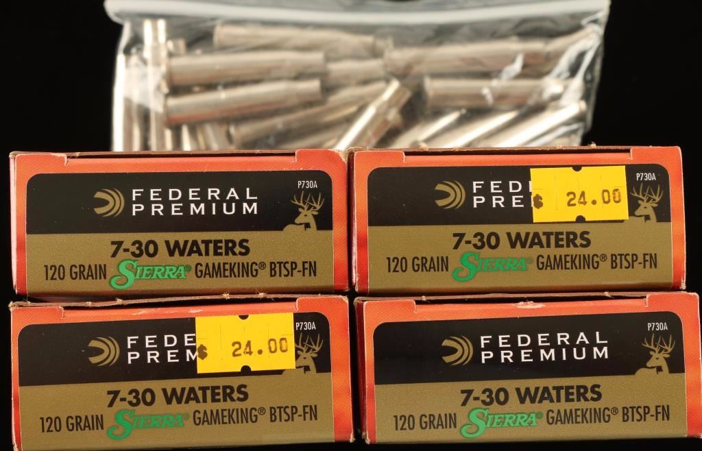 Three and 1/2 boxes of Federal Premium Vital Shok 120 Gr. 70 Rds. All in original boxes. Also includes 30 Rounds of 7-30 Waters brass.