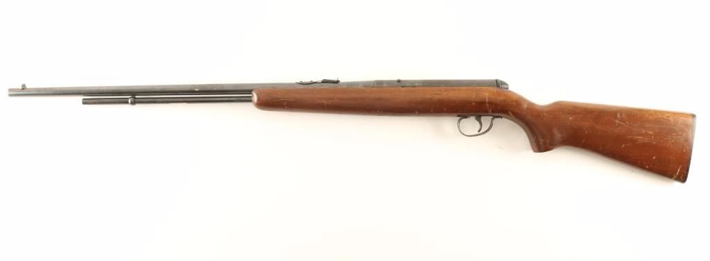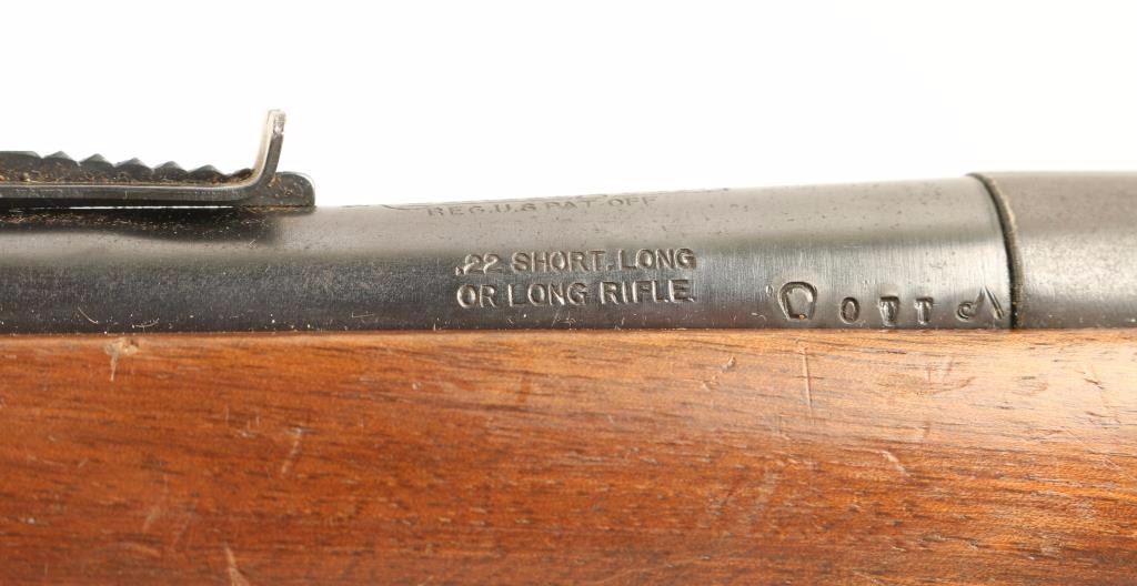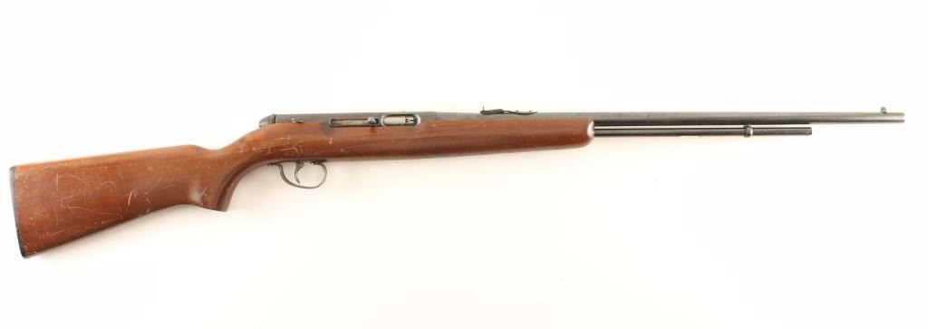 Vintage American made tube-fed semi-automatic sporting rifle chambered in .22 Short, Long or Long Rifle. Features a blued finish, 24" barrel, 4/5 length magazine tube(missing magazine), dovetailed blade front sight, adjustable rear sporting sight, case hardened serrated trigger, manual safety, baton shaped charging handle and one-piece smooth wood pistol grip shoulder stock with factory hard rubber buttplate. Rifle exhibits approximately 70% of it's original blued finish showing scattered handling wear/scratches & some light surface rust. Action performs well, bore appears good and wood stock is good with numerous small blemishes. Condition is fair to good. ***C&R Firearm*** ***Modern Firearm***