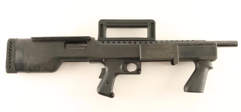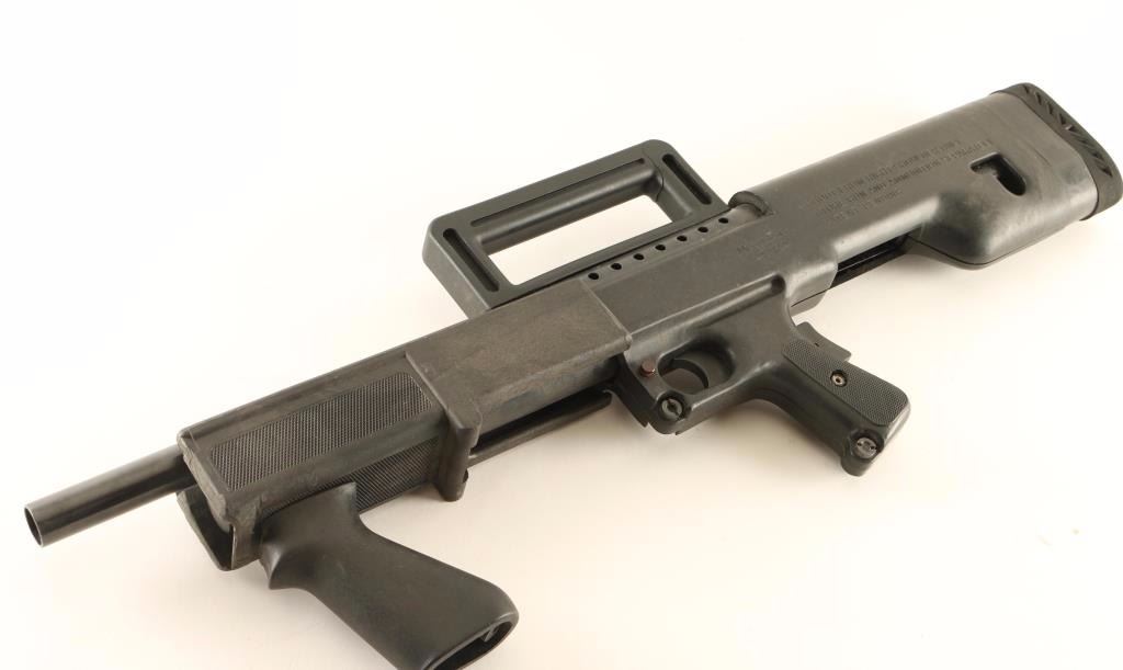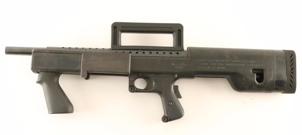 Bullpup configured slide action shotgun chambered for 2 3/4" & 3" 12 gauge shells. Features a blued/black finish, 18.5" barrel, 4/5 length tube magazine, ventilated metal barrel shroud, black synthetic carry handle with open sights, push button safety, grip safety, smooth metal trigger, checkered slide handle with smooth vertical grip, and factory bullpup style black synthetic stock with checkered pistol grip, shell deflector, recoil pad & 14 5/8" LOP. Shotgun exhibits mild wear and shows a few small scattered spots of light surface rust on the barrel shroud. Action performs well, bore is good and synthetic stock is good with tooling marks on the front of the slide handle. Condition is good to very good. ***Modern Firearm***