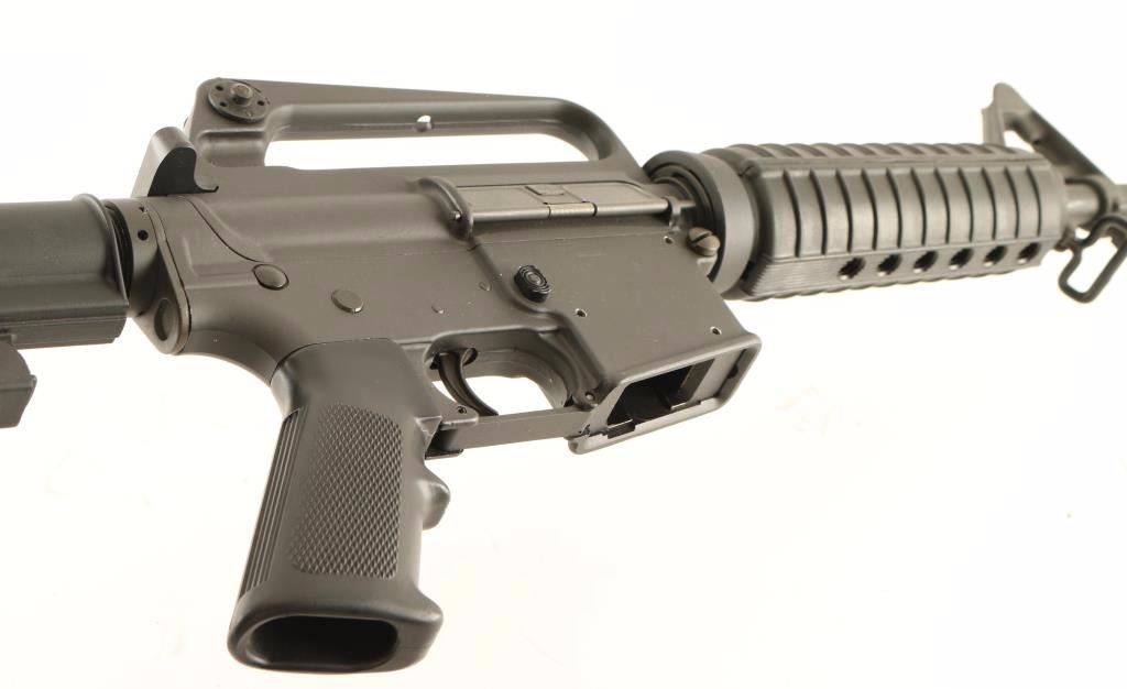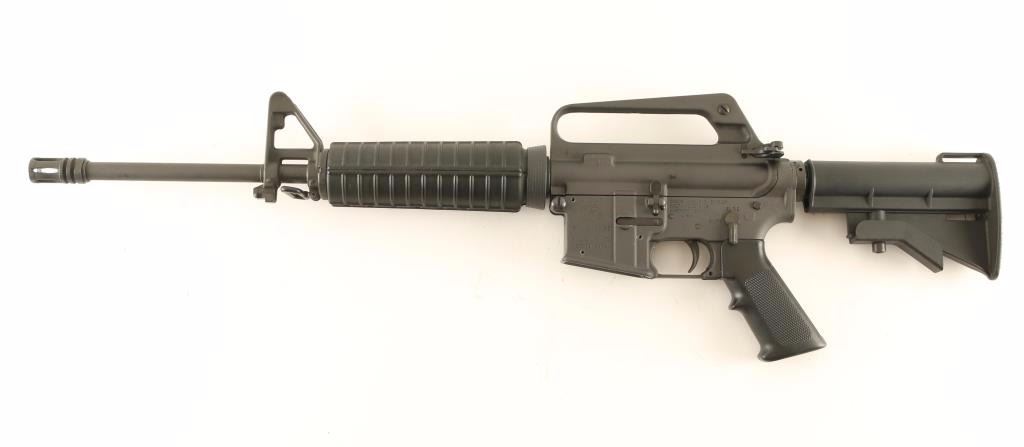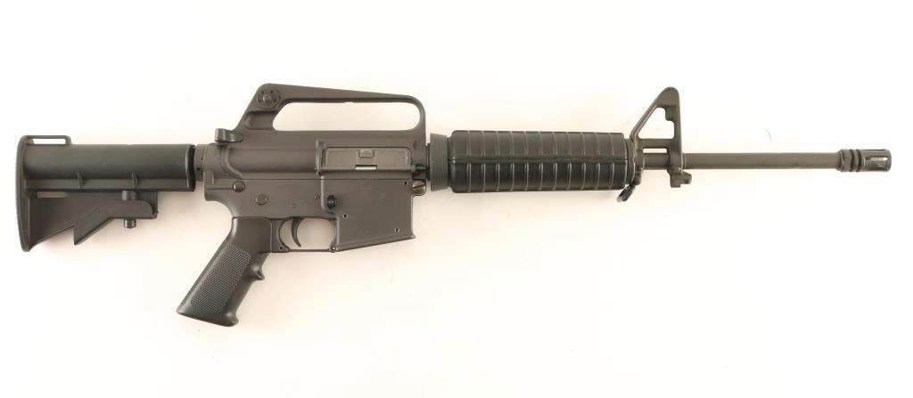 'Model 6450' Pre-ban semi-automatic AR platform rifle chambered in 9x19mm. Features a matte grey finish, 16.25" chrome bore barrel, A1 birdcage style flash hider, A2 style post front sight with bayonet lug, windage adjustable dual aperture rear sight in the carrying handle, synthetic carbine length handguard, no shell deflector, a dust cover, thumb safety, push button magazine release, no magazine, smooth trigger, A2 style pistol grip, and two-position collapsible shoulder stock. Rifle exhibits approximately 97% of it's original matte finish showing light handling marks & scuffs and two small spots of what looks like black paint. Action is smooth, bore is pristine and synthetic stocks are fine Condition is near excellent. ***Modern Firearm***