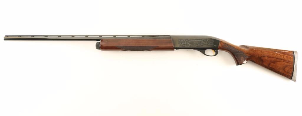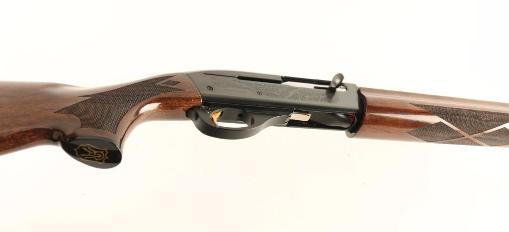 Recoil operated semi-automatic shotgun chambered for 2 3/4" & 3 " 20 Gauge shells. Features a blued finish, 28" vent rib barrel with removable modified choke, white bead front sight, silver bead mid-sight, half length magazine tube, polished bolt, floral scroll engraved receiver, push button safety, gold trigger and high gloss fancy checkered walnut forend and pistol grip shoulder stock with factory recoil pad. Includes the original factory cardboard box with documents, lock, plug, choke tool and full & imp cyl chokes. Shotgun exhibits approximately 98% of it's original finish showing a small blemish on the trigger guard. Action is strong, bore is excellent and wood stocks are very good++ with some blemishes. Condition is near excellent in box. ***Modern Firearm***