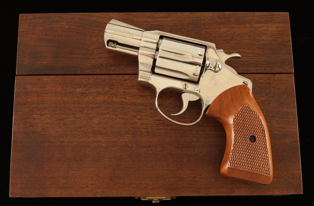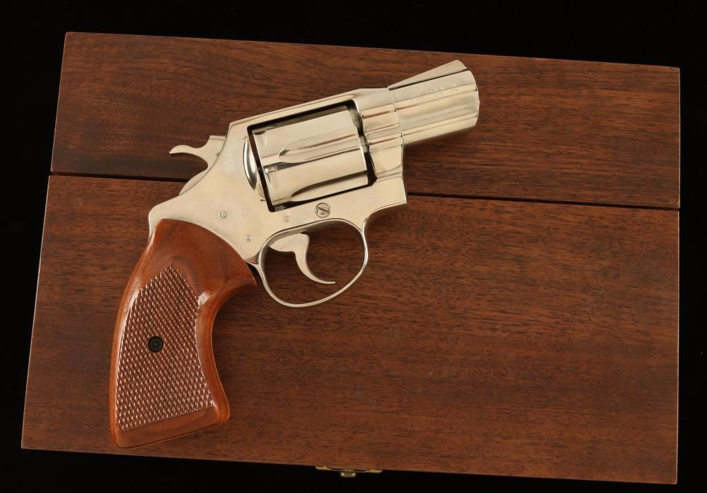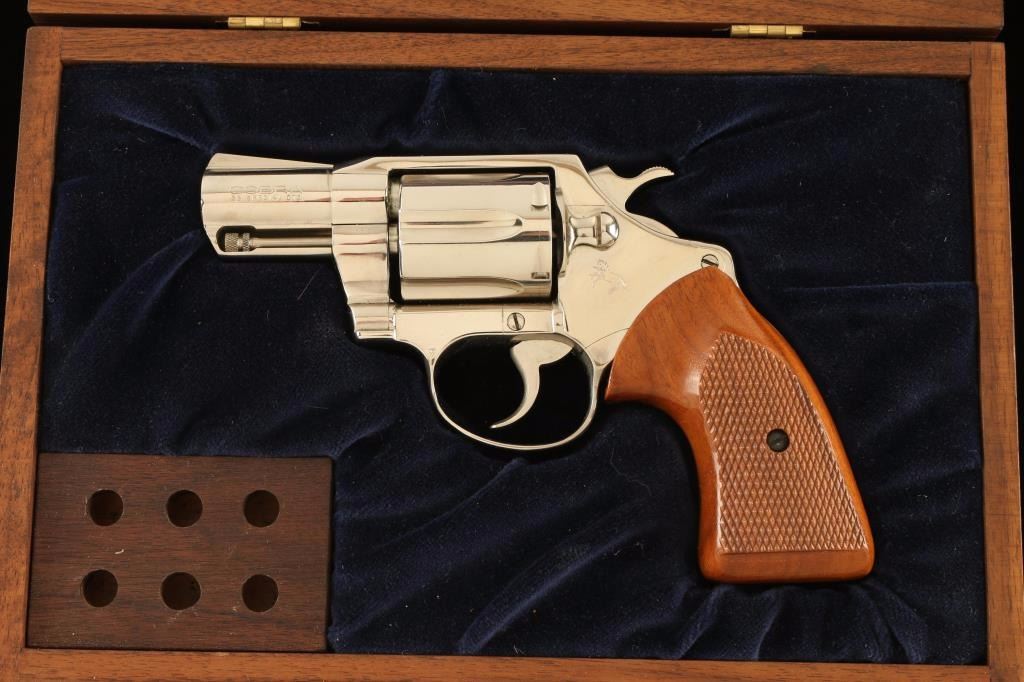 '2nd Issue' Lightweight snub-nosed double action revolver chambered in .38 Special, circa 1977. Features a nickel plated finish, 2" barrel with full underlug, ramp front sight, square notched rear sight, long fluted six-shot cylinder, smooth trigger, serrated hammer spur and two piece checkered walnut grips. Includes a custom made wood presentation case with blue velvet lined fitted interior and a wood cartridge block. Revolver exhibits approximately 99% of it's original nickel plating which shows light handling marks and a thin drag line on the cylinder. Action is smooth with solid lock-up, bore is excellent, and grips are fine. Condition is excellent. ***Modern Firearm***
