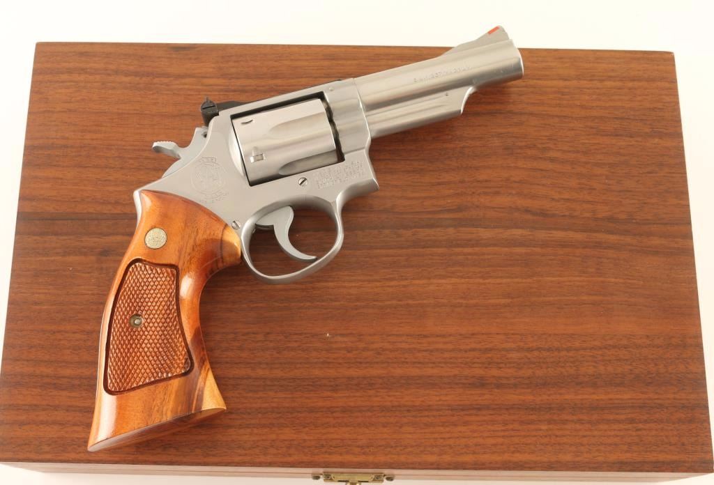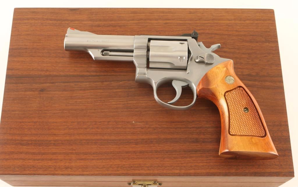 'Combat Magnum' Medium frame stainless steel double-action revolver chambered in .357 Magnum, circa 1970-1977. Features a brushed finish, pinned 4" barrel with serrated top rib, shrouded ejector rod, raised ramp front sight with orange insert, micrometer click adjustable rear window sight with white outline, fluted six-shot cylinder with recessed chambers, .265" service trigger, .375" semi target hammer, square butt K target frame with ten groove serrated grip straps and two-piece checkered walnut target grips with silver S&W medallions. Includes a wood presentation case with a blue velvet lined fitted interior, cartridge block and instructions. Revolver exhibits moderate handling wear and a light drag line on the cylinder. Action is smooth with solid lock-up, bore is pristine, and wood grips are fine. Condition is very good++ in case. ***Modern Firearm***