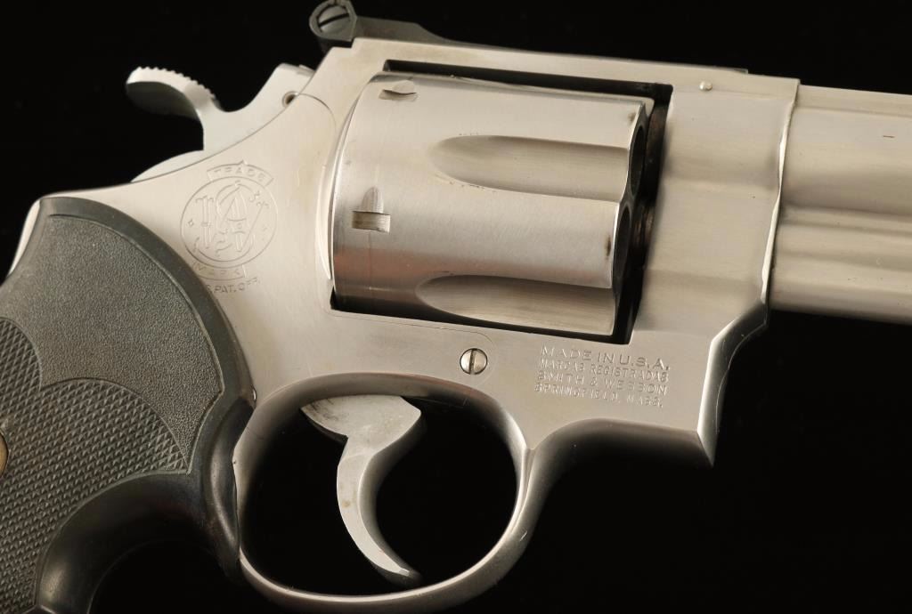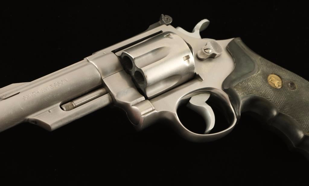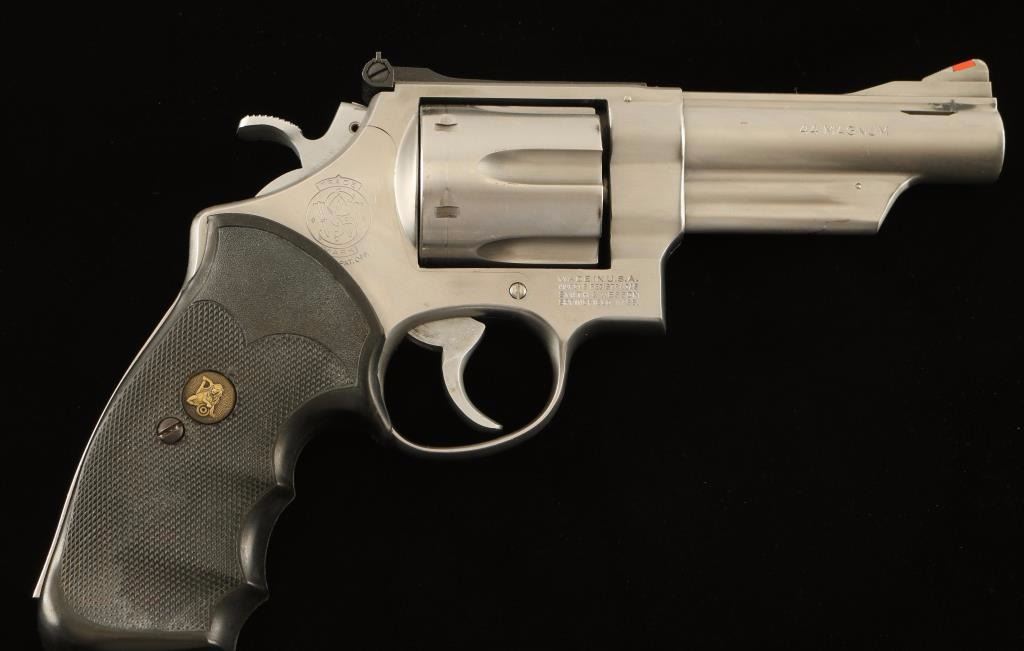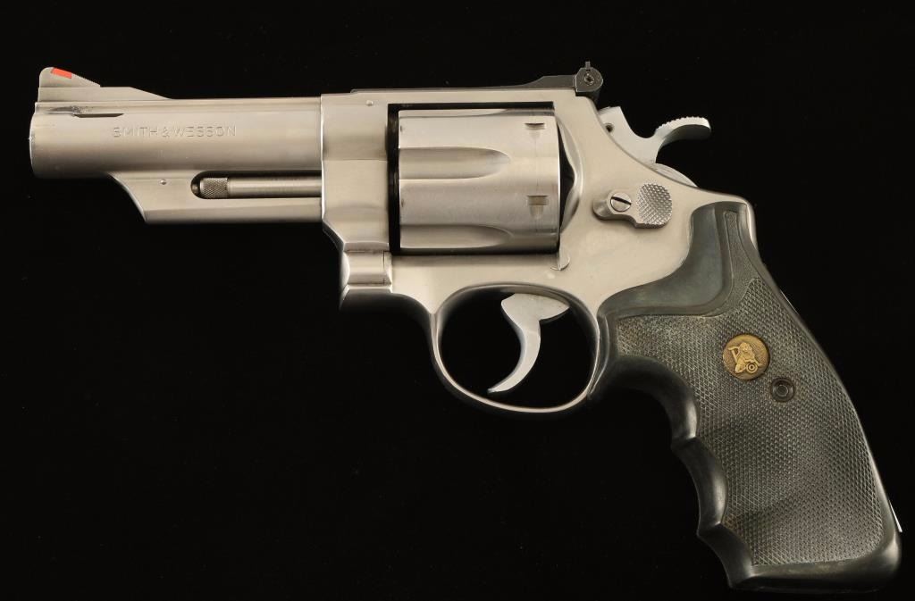Large frame stainless steel double-action revolver chambered in .44 Magnum, circa 1981-1982. Features a brushed finish, pinned 4" Magna ported barrel with solid rib, shrouded ejector rod, raised ramp front sight with orange insert, micrometer click rear sight with white outline, fluted six-shot cylinder with recessed chambers, .400" smooth target trigger, .500" target hammer, and Pachmayr Gripper checkered black rubber finger groove grips. Revolver shows light handling marks, some minor holster muzzle wear and a drag line on the cylinder. Action is very smooth with good lock-up, bore is excellent and rubber grips are very good. Condition is very good++.. ***Modern Firearm***