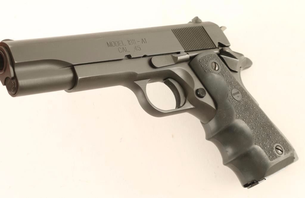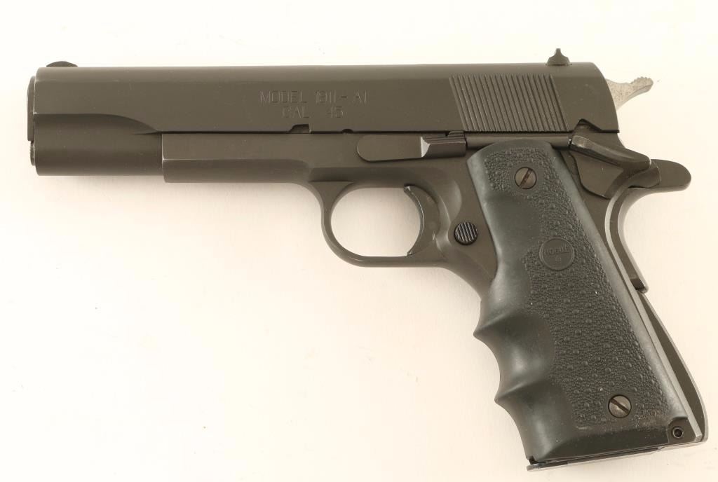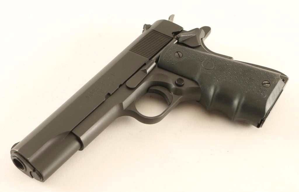 Standard 1911-A1 style single action semi-automatic pistol chambered in .45 Automatic. Features parkerized finish, 5" barrel, low-profile blade front sight, dovetailed rear window sight, serrated trigger, serrated hammer spur, thumb safety, beavertail grip safety, push button magazine release, 7 round magazine, serrated arched mainspring housing and one-piece Hogue pebbled black rubber wrap-around finger groove grip. Pistol exhibits approximately 97%+ of it's original parkerized finish showing light edge/muzzle wear and a few scattered scratches/losses. Action is strong, bore is pristine and rubber grips are fine. Condition is near excellent. ***Modern Firearm***