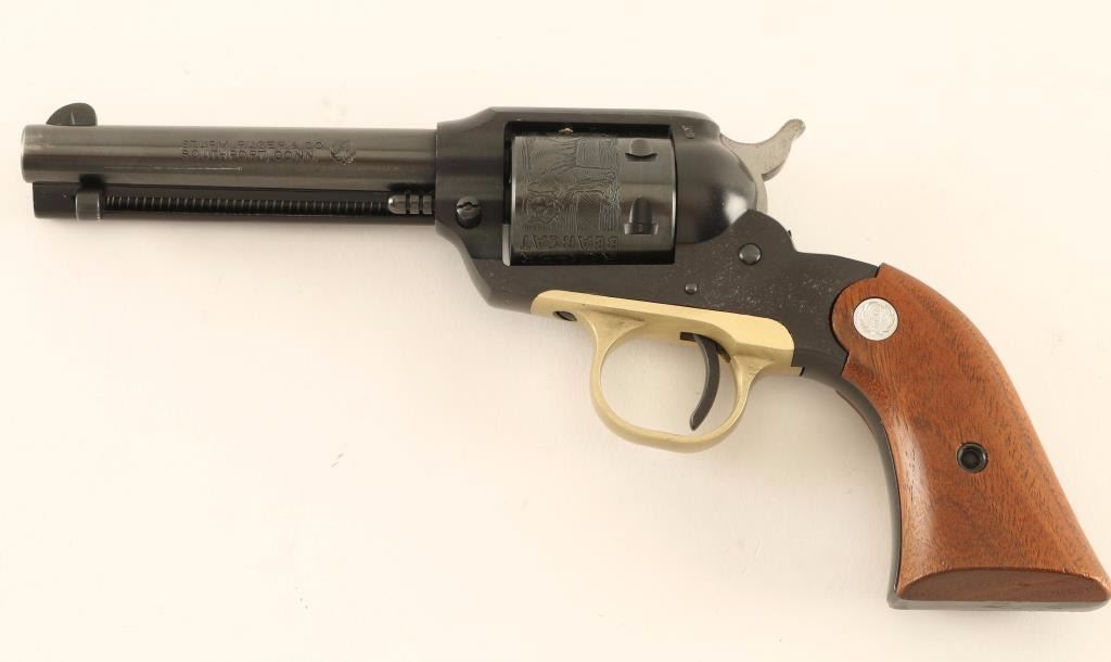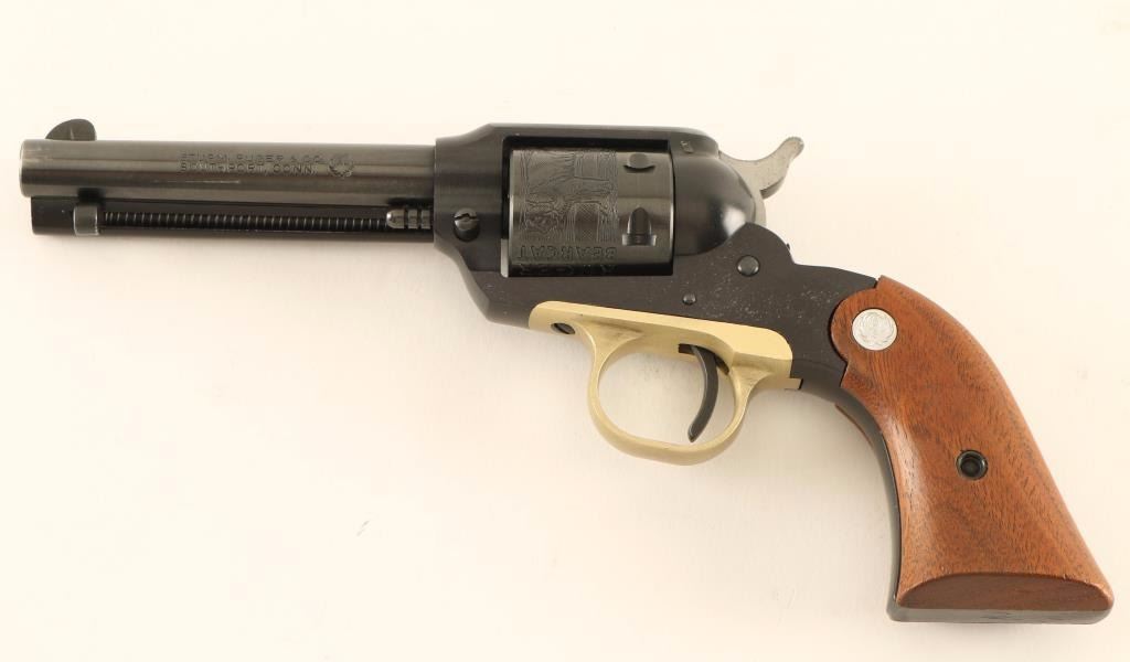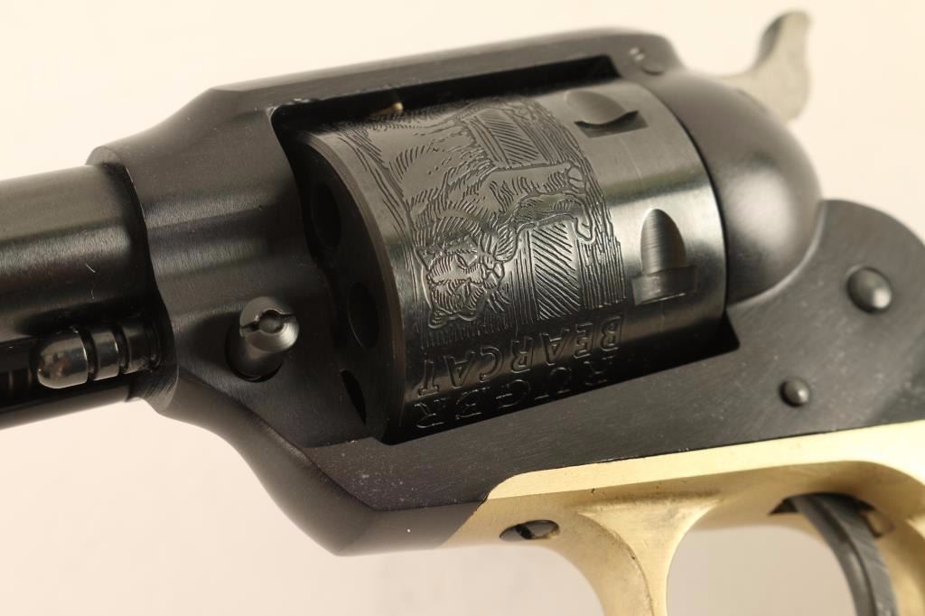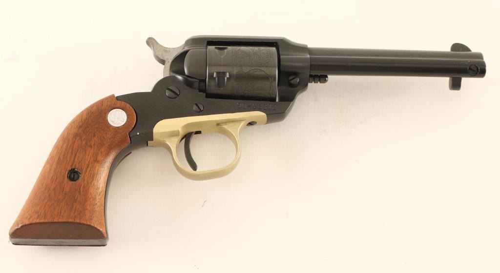 Vintage small frame single-action revolver modeled along the lines of the Remington 1890 and chambered in .22 Long Rifle, circa 1969. Features a blued/black anodized finish, 4" barrel, blade front sight, square notched rear sight, ejector rod, alloy frame, non-fluted six shot cylinder with roll-stamped bear & cat scenes, brass colored anodized alloy trigger guard, serrated hammer spur, smooth trigger and two-piece smooth wood grips with Ruger medallions. Revolver exhibits approximately 94% of it’s original finish showing light muzzle wear, a faint drag line on the cylinder, a few dings and some light peppered flaking on the left side of the frame. Action is crisp, bore is excellent, and wood grips very good+. Condition is very good+++. ***Modern Firearm***