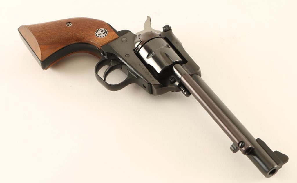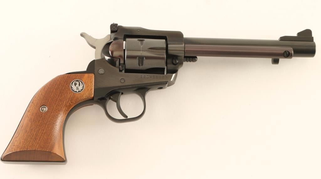SN: 650-22867 'SSM' Small frame single-action revolver chambered in .32 Harrington & Richardson Magnum, circa 1986. Features a blued finish, 5 1/2" barrel, raised ramp front sight, adjustable rear window sight, ejector rod, fluted six-shot cylinder, transfer bar safety, smooth trigger, serrated hammer spur, black finished alloy grip frame and two-piece smooth wood grips with Ruger medallions. Revolver exhibits approximately 94% of it's original finish showing slight muzzle wear, some small scattered blemishes, finish loss in the cylinder flutes and a light drag line. Action is smooth with tight lock-up, bore is excellent and wood grips are fine. Condition is very good++. ***Modern Firearm***
