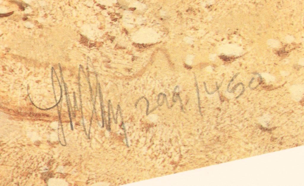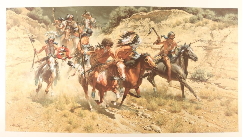 "The Decoys" 299/450 and signature in pencil lower right. Image measures 40"x21" and includes brass title plate for framing. Print only with information on artist in Greenwich Workshop folio. Frank McCarthy was born in New York City and was drawn to the West since he read Will James novels as a boy. He was also intrigued by N.C. Wyeth illustrations. Frank McCarthy's formal training was at the Pratt Institute and had a career in commercial art and as an illustrator. The lure of the West was strong and he eventually settled in Sedona, AZ and became a member of the Cowboy Artists of America. Frank has had several shows in prominent museums and his work has appeared in many national magazines.