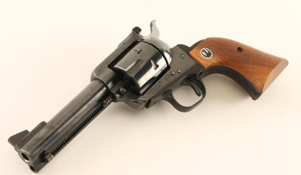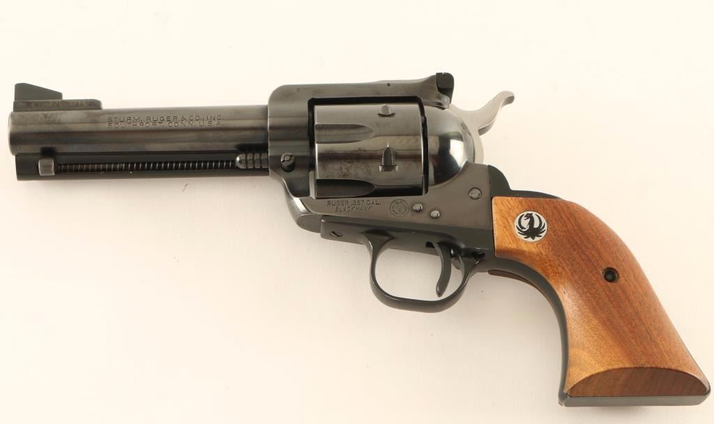 Vintage American made six-shot single action revolver chambered in .357 Magnum, circa 1971. Features a blued finish, 4 5/8" barrel, raised ramp front sight, adjustable rear window sight, ejector rod, fluted cylinder, flat top three-screw frame, smooth trigger, serrated hammer spur, black anodized aluminum alloy grip frame and two-piece smooth walnut grips with Ruger medallions. Revolver exhibits approximately 90% of it's original blued finish showing light holster wear, a small area of scattered oxidation on the barrel behind the rear sight, a couple small spots of pin prick pitting on the top of the frame, and a light drag line on the cylinder. The grip frame shows a small gouge & some fading on the backstrap and some edge wear on the butt & corners of the trigger guard where it meets the frame. Action is smooth with very good lock-up, bore is excellent and wood grips are fine. Condition is excellent. ***Modern Firearm***