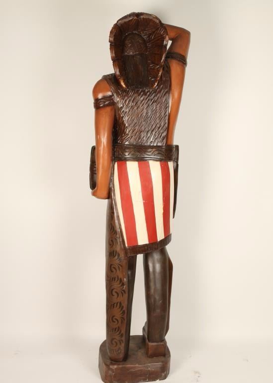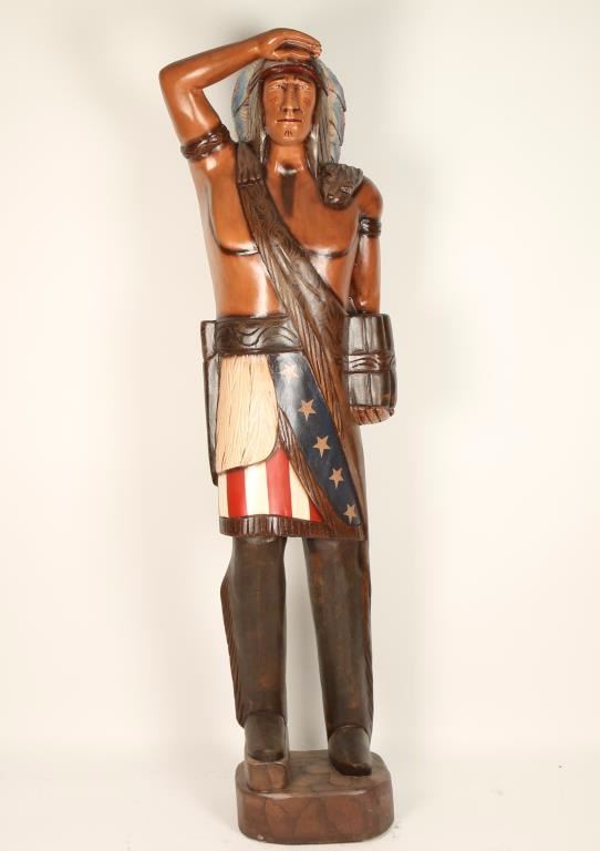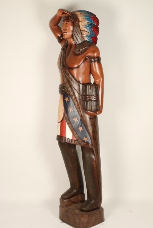 Newer reproduction of Indian looking out into the distance wearing headdress and holding cigars with an American flag loincloth. Measures 79"h x 20"w x 18"d.