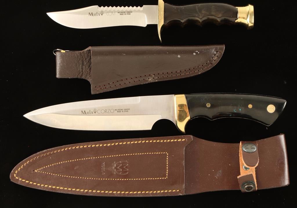 (1) Muela Corzo tactical bowie knife with a 6 1/2" blade and brass hilt. Polymer handle has brass tack design with a Muela logo medallion. Measures 12" overall and comes in a brown leather logo embossed sheath. (1) Muela COM-G-16 ALCE Military Tactical with top serrations. Approx. 4 7/8" blade with a brass hilt. Polymer handle is molded for easy grip with a brass endcap. Measures 10 ' overall and comes in a brown leather belt sheath. Both knives are marked with 'Muela' and maker specs. Muela knives are custom Spanish hunting knives that have been made by the Muela family for generations and utilize tough Vanadium stainless steel.