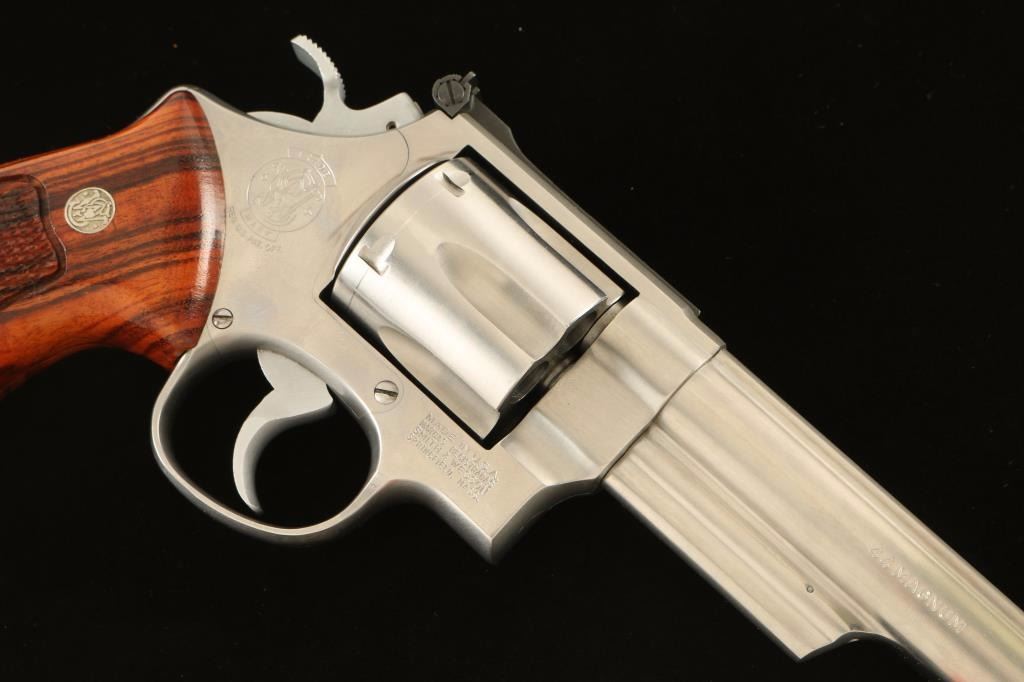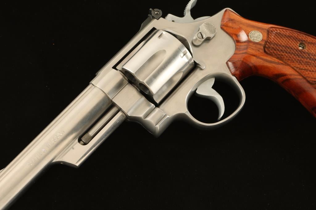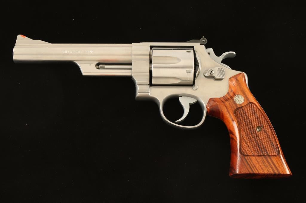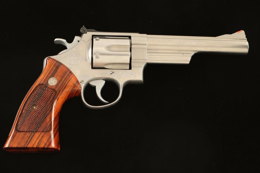Large frame stainless steel double-action revolver chambered in .44 Magnum, circa1988-1989. Features a brushed finish, 6" barrel with solid top rib, shrouded ejector rod, raised ramp front sight with orange insert, adjustable micrometer click rear sight with white outline, fluted six-shot cylinder, .400" smooth target trigger, .500" target hammer, and two-piece checkered walnut Target grips with silver S&W medallions. Includes a factory cardboard box with documents. Revolver exhibits slight muzzle wear, a light drag line and few minor handling marks with no major wear observed. Action is very smooth with tight lock-up, bore is pristine and wood grips are fine. Condition is excellent. ***Modern Firearm***